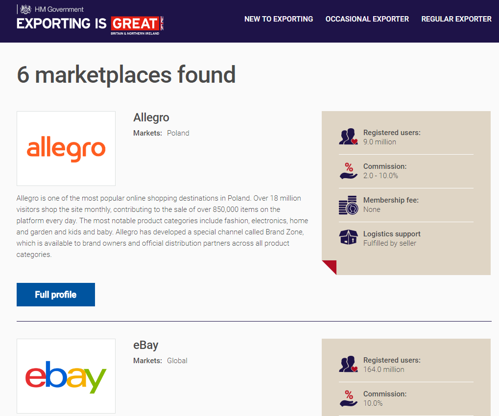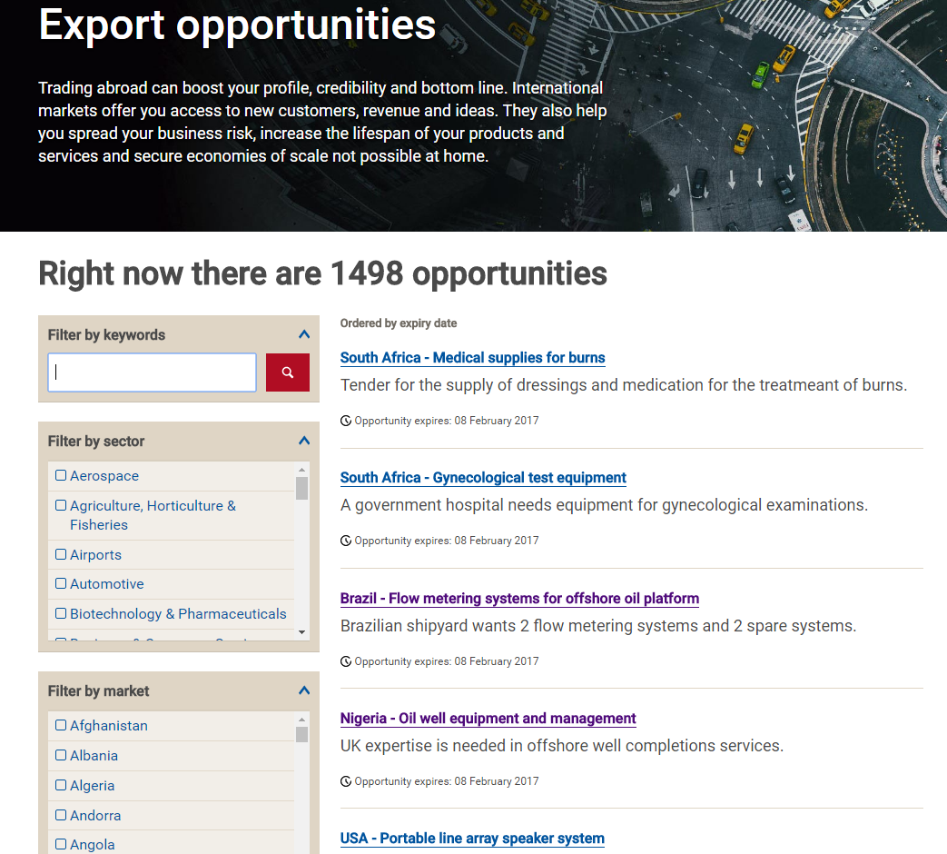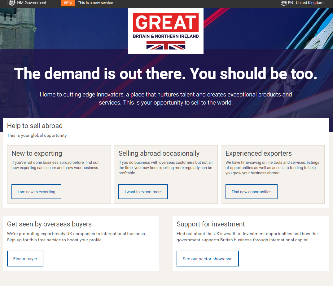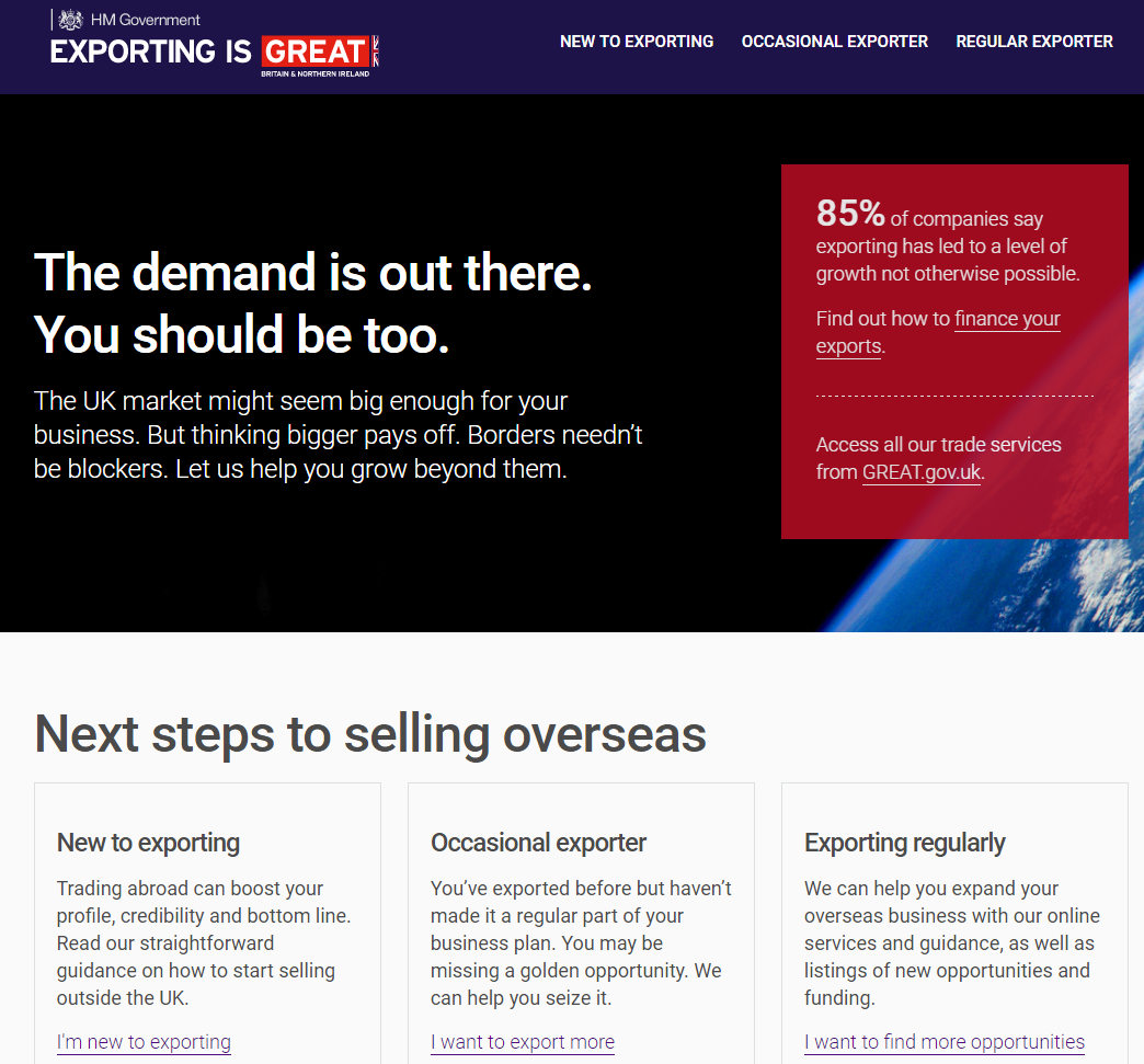 Podstrona dotycząca eksportu przeznaczona jest dla firm funkcjonujących w Wielkiej Brytanii i podzielona jest na trzy sektory – dla firm rozpoczynających eksportowanie, dla firm, które chciałyby eksportować więcej oraz dla firm eksportujących regularnie. Spośród oferowanych narzędzi warto wymienić wyszukiwarkę targowisk online w poszczególnych krajach (ze szczegółowo opisanymi profilami) oraz wyszukiwarkę aktualnych przetargów międzynarodowych (z możliwością aplikowania online). Dostępne są również liczne materiały edukacyjne, w tym webinary, dotyczące m.in. logistyki, finansowania, docierania do konsumentów online czy prezentacji w komunikacji twarzą w twarz. Użytkownicy mogą także zapoznać się z raportami opisującymi realia wszystkich rynków, na których obecna jest Wielka Brytania.