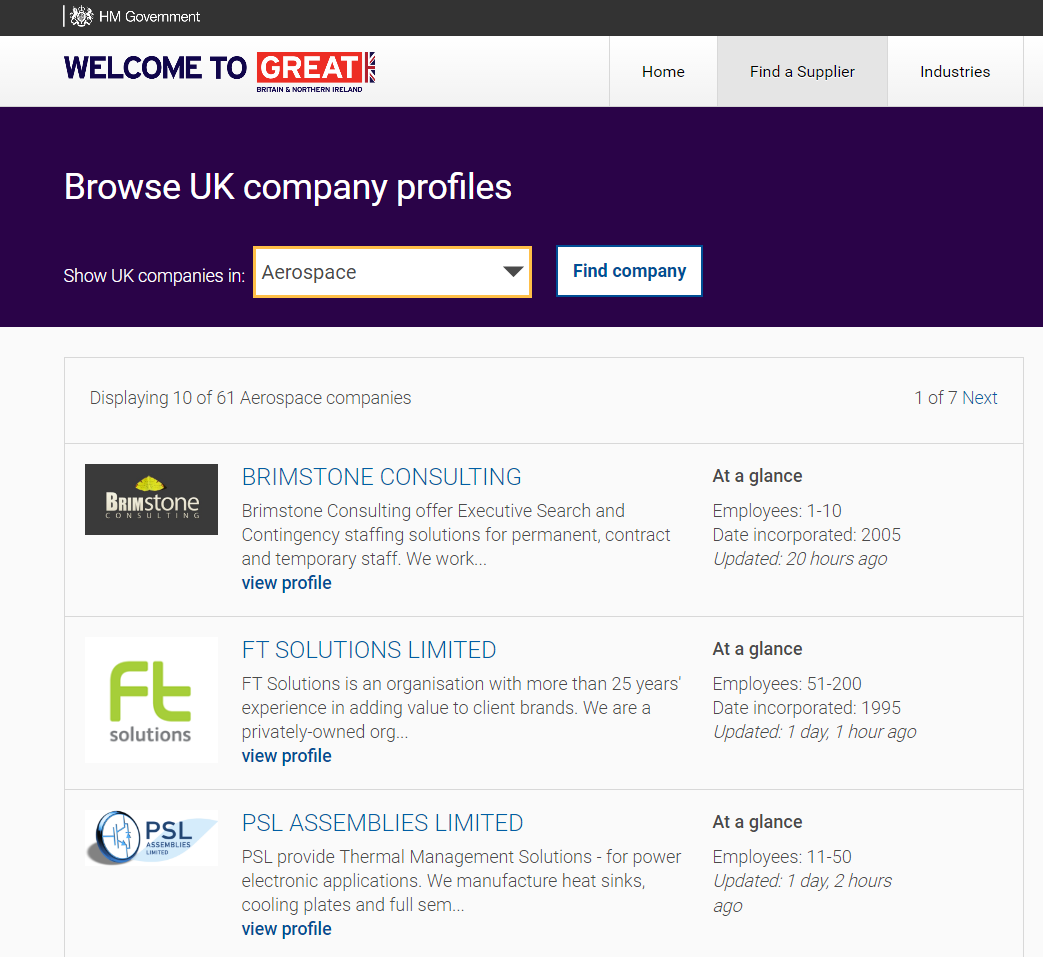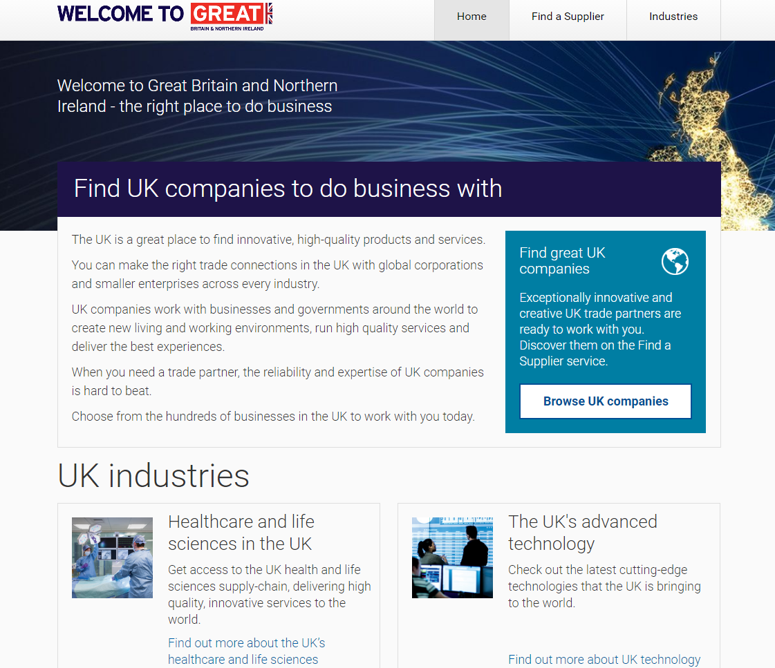 Podstrona dotycząca handlu zawiera bazę firm z Wielkiej Brytanii z możliwością filtrowania ich pod względem branży – usługa ta nazywa się Find a Supplier i jest drugą stroną usługi Find a Buyer. Podstrona skierowana jest do organizacji zainteresowanych importem dóbr i usług z Wielkiej Brytanii, a jej funkcją jest ułatwienie im odnalezienia kontrahentów. Istnieje również możliwość wysłania wiadomości wybranym firmom z poziomu ich profilu.