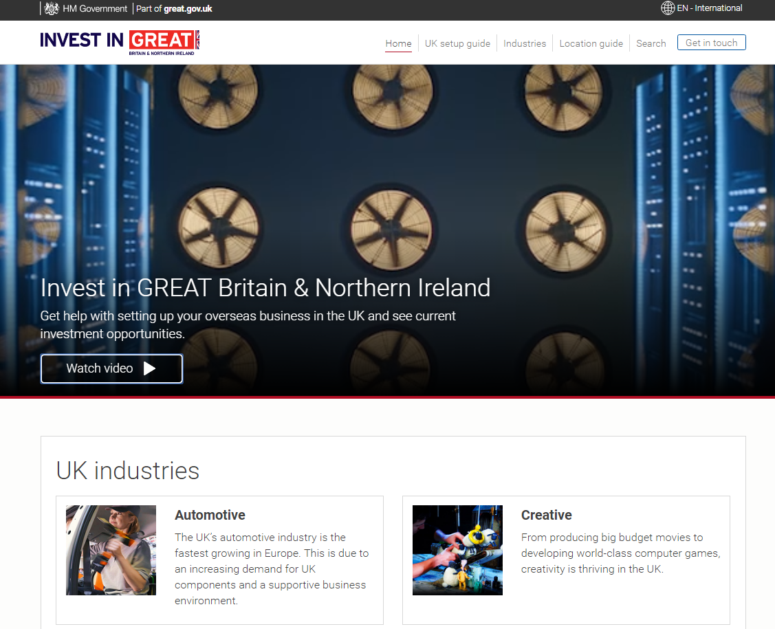 W listopadzie 2016 w ramach działań Departamentu Handlu Zagranicznego powstała platforma Great.gov.uk, oferująca usługi i informacje dotyczące handlu, inwestowania, turystyki oraz edukacji w Wielkiej Brytanii. Zrealizowana została według tych samych założeń co Gov.uk, jednak charakteryzuje się zdecydowanie bardziej marketingowym podejściem – jej celem jest częściowo „sprzedanie” Wielkiej Brytanii jako kraju wielkich możliwości dla inwestorów, atrakcyjnego turystycznie i oferującego doskonałą edukację, jak również promowanie eksportu wśród firm z Wielkiej Brytanii. Prezentowane na stronie treści różnią się zależnie od wybranej lokalizacji – w przypadku wejścia na brytyjską wersję prezentowane są treści dotyczące eksportu, w przypadku wersji międzynarodowej są to odnośniki do podstron dotyczących importu, inwestowania, edukacji oraz turystyki. Portal wyróżnia się bardzo dużą ilością przydatnych informacji oraz narzędzi.