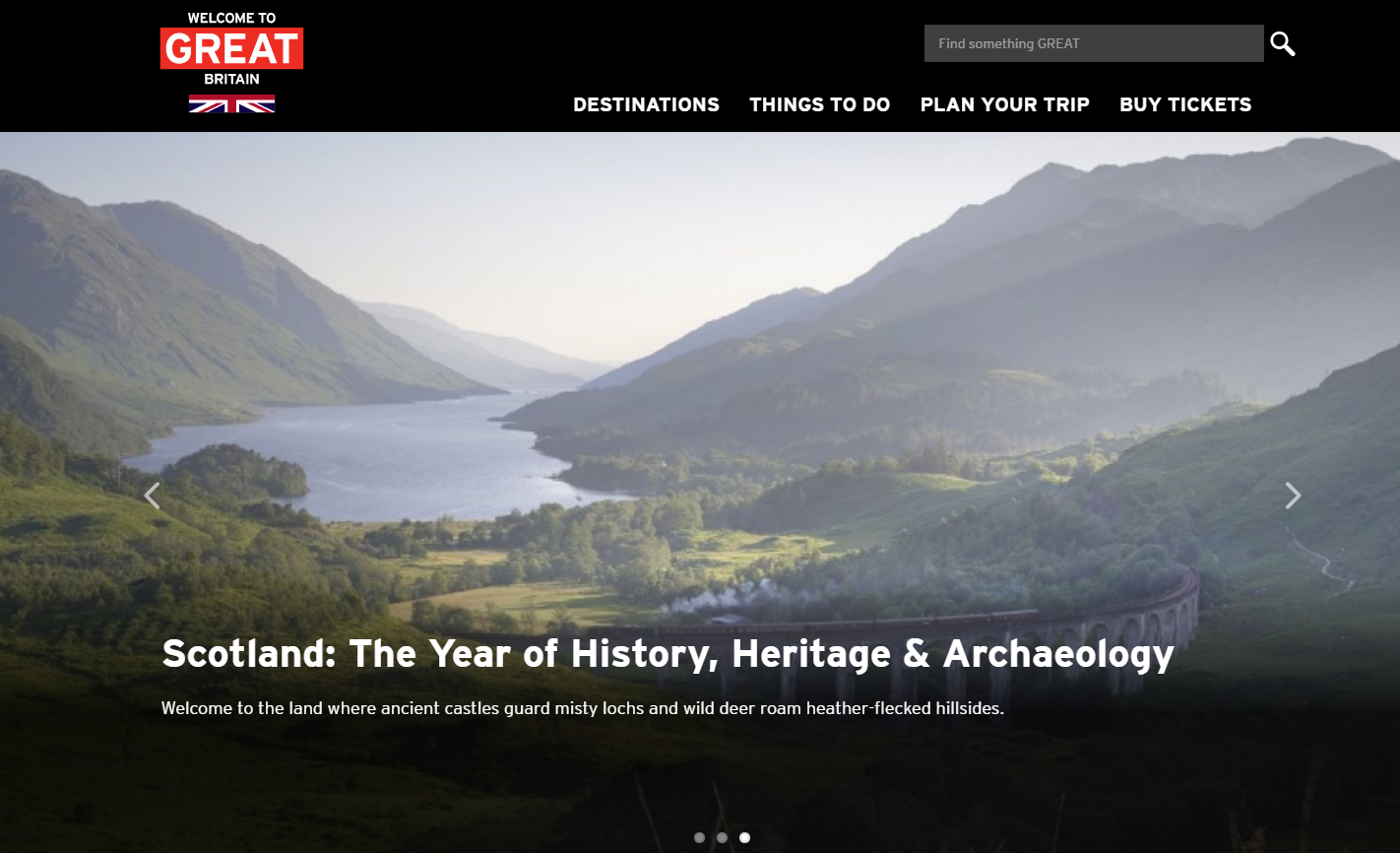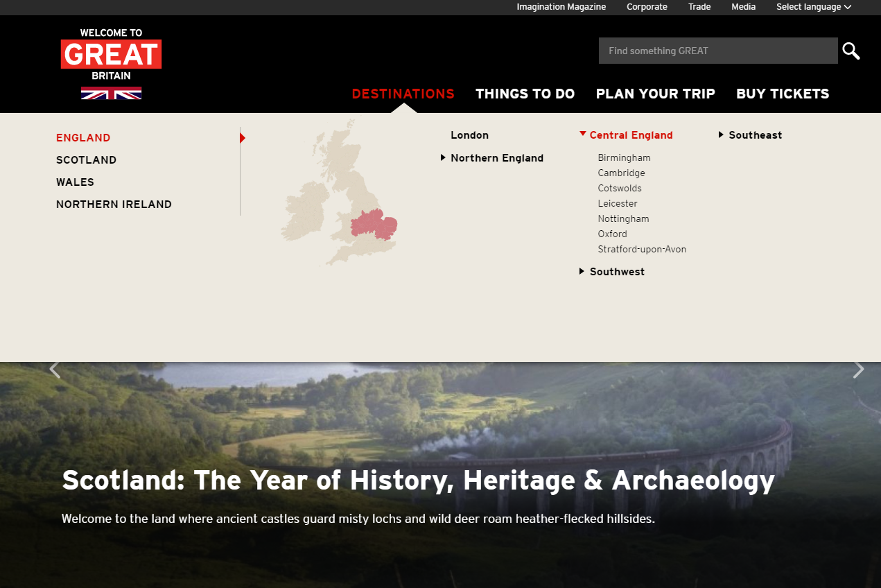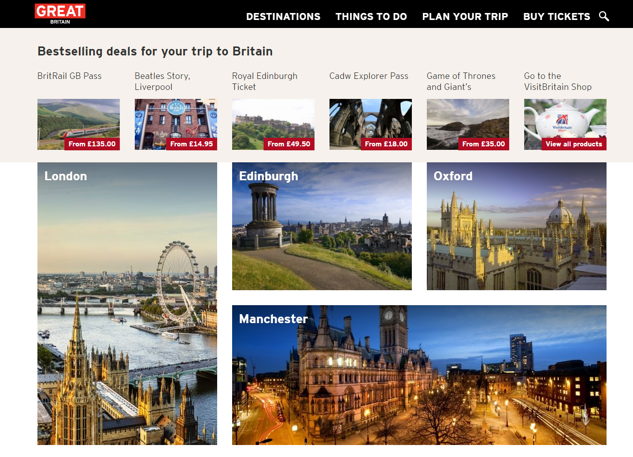 Visit Britain jest rządowym portalem turystycznym stworzonym w ramach platformy Great.gov.uk, który wyróżnia się świetnym wykonaniem zarówno pod względem UX, jak i UI. Oprócz informacji o regionach oraz możliwych aktywnościach, za pośrednictwem strony można również zakupić online bilety na wybrane aktywności.