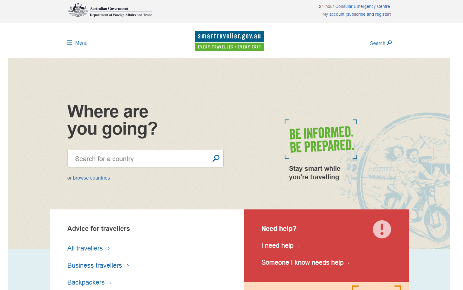 Smartraveller jest portalem zawierającym informacje turystyczne dla obywateli Australii, stworzonym przez Departament Spraw Zagranicznych i Handlu. Znajdują się na nim porady dla różnych kategorii podróżników, jednak główną korzyścią jest baza bardzo szczegółowych raportów dotyczących poszczególnych państw. Żeby uzyskać do nich dostęp, wystarczy wpisać nazwę państwa w polu wyszukiwania.