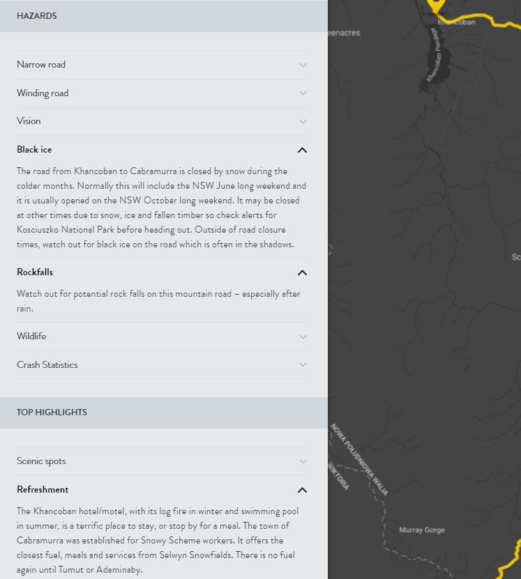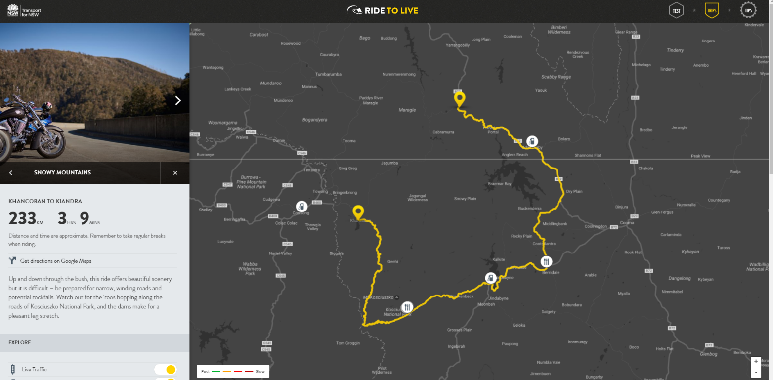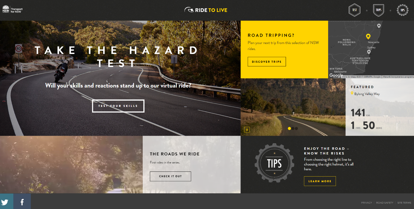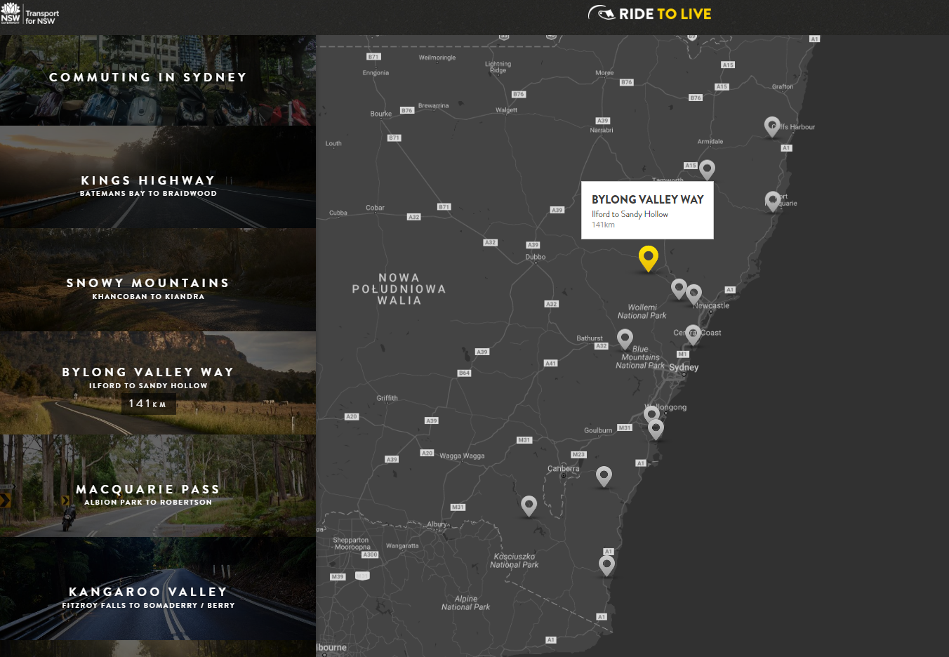 Strona Ride to Live została stworzona na zlecenie rządu Nowej Południowej Walii, a jej funkcją jest promowanie turystyki motocyklowej oraz bezpiecznej jazdy. Na stronie znajdują się filmy prezentujące wybrane trasy, spoty z telewizyjnej kampanii społecznej, porady, test jazdy na motocyklu oraz lista tras motocyklowych przedstawiona na interaktywnej mapie – jest ona najbardziej przydatną dla użytkowników częścią strony. Informacje zamieszczone na niej zawierają m.in. specyfikę trasy, zagrożenia oraz punkty sceniczne. Możliwe jest również sprawdzenie, gdzie na trasie znajdują się restauracje, stacje paliw, światła czy noclegi.