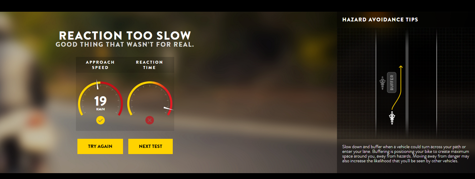 Dużą częścią strony jest również wirtualny test jazdy motocyklem, sprawdzający znajomość przepisów oraz szybkość reakcji. Jest on zrealizowany w formie interaktywnych filmów stworzonych w widoku pierwszej osoby, w których użytkownik może obracać „głową” oraz reagować na powstające niebezpieczne sytuacje hamowaniem lub wyborem jednej z dwóch opcji.