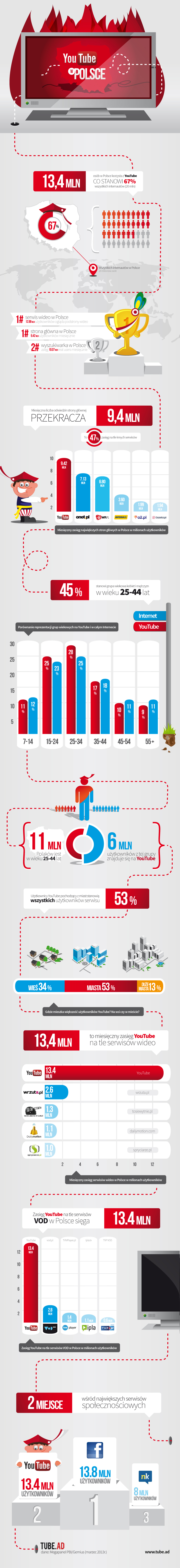 YouTube obecnie to już nie tylko śmieszne filmy oglądane przez nastolatków. To również profesjonalne kanały tematyczne, firmowe, klasyka polskiego kina czy fachowe materiały edukacyjne. Największą grupą docelową są osoby w wieku 25-34 lata (28%) oraz 35-44 (17%). Aż 6 mln ludzi na YouTube to grupa w wieku 25-44 lat. Natomiast w serwisach społecznościowych YouTube zbliżył się do poziomu Facebooka, który ma 13,8 mln aktywnych użytkowników.