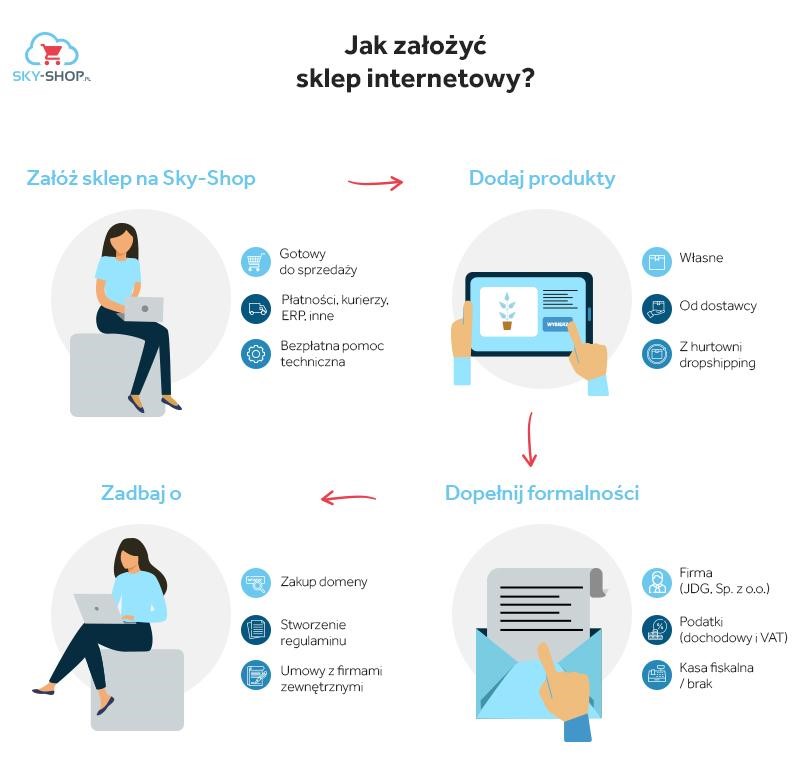 Cały proces otwierania sklepu internetowego na Sky-Shop w uproszczeniu przebiega następująco: