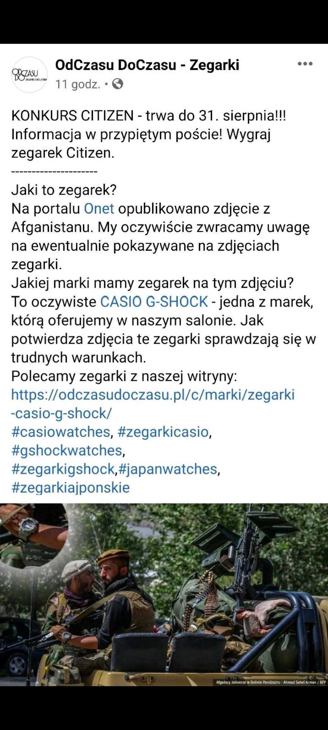 Przedmiot został wyraźnie zaznaczony na fotografii. Dodatkowo pojawiła się informacja o konkursie i opis: „Na portalu Onet opublikowano zdjęcie z Afganistanu. My oczywiście zwracamy uwagę na ewentualnie pokazywane na zdjęciach zegarki. Jakiej marki zegarek mamy na tym zdjęciu? To oczywiście CASIO G-SHOCK – jedna z marek, którą oferujemy w naszym salonie. Jak potwierdza zdjęcie, te zegarki sprawdzają się w trudnych warunkach. Polecamy zegarki z naszej witryny”.