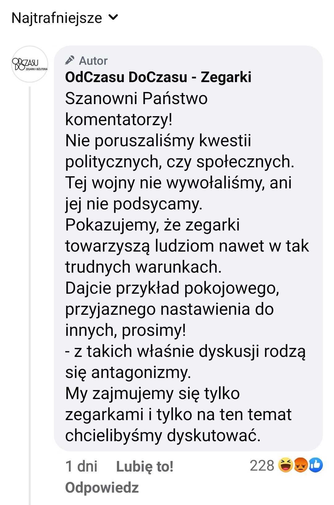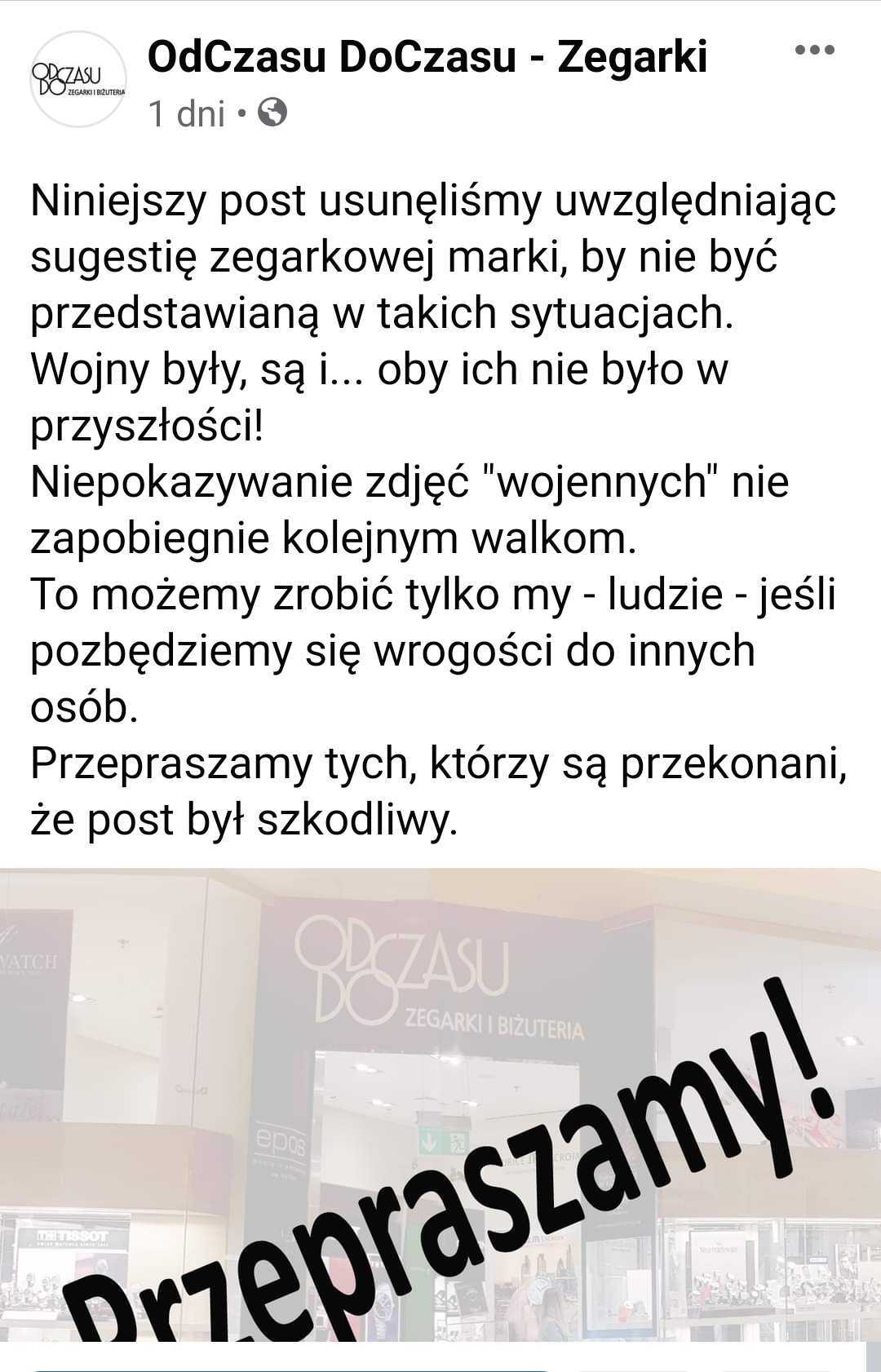 Na profilu możemy do tej pory przeczytać: „Niniejszy post usunęliśmy uwzględniając sugestię zegarkowej marki, by nie być przedstawianą w takich sytuacjach. Wojny były, są i… oby ich nie było w przyszłości! Niepokazywanie zdjęć „wojennych” nie zapobiegnie kolejnym walkom. To możemy zrobić tylko my – ludzie – jeśli pozbędziemy się wrogości do innych osób. Przepraszamy tych, którzy są przekonani, że post był szkodliwy”.