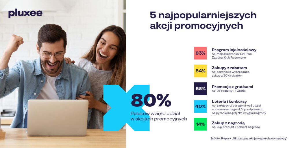 - Polacy najczęściej korzystali z: programów lojalnościowych (83%), promocji z gratisami (63%), zakupów z rabatem (54%), loterii i konkursów (40%), zakupów z nagrodą/prezentem (14%).