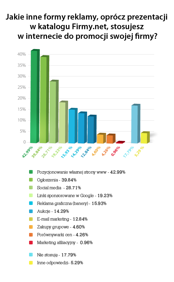 – Z naszych badań wynika, że 18% respondentów nie prowadzi dodatkowych, poza obecnością na portalu Firmy.net, działań reklamowych w internecie. To pokazuje, jak konieczne są działania, podnoszące świadomość przedsiębiorców w kwestii pełnego wykorzystywania możliwości promocji małej firmy w sieci. – podkreśla Michał Kurczycki.