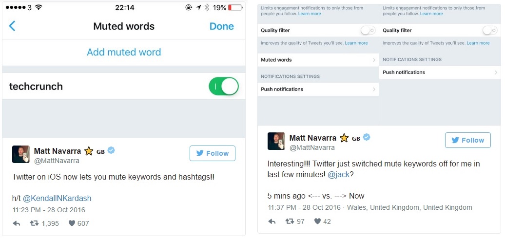 Kolejną zmianą, która być może będzie wprowadzona na Twitterze, jest możliwość automatycznej blokady tweetów zawierających zdefiniowane słowa kluczowe. Taka wiadomość pojawiła się w minionym tygodniu na stronie serwisu The next web. Nie jest jednak do końca wiadome, kiedy i czy w ogóle ta funkcja zostanie wprowadzona na stałe. Część użytkowników korzystających z Twittera na iOS zauważyła wprowadzone zmiany, jednakże zostały one bardzo szybko wyłączone.