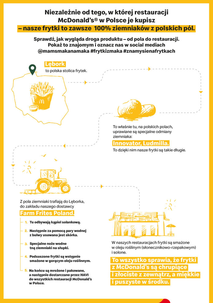 – Wyjątkowy smak naszych frytek zawdzięczamy ziemniakom, uprawianych na polskich polach. Specjalnie wyselekcjonowane odmiany Innovator i Ludmilla charakteryzują się owalnymi, podłużnymi bulwami, kremową barwą oraz odpowiednią zawartością skrobi. Prosto z pola trafiają do naszego dostawcy – firmy Farm Frites Poland, która już od ponad 25 lat dostarcza frytki do restauracji McDonald’s nie tylko w Polsce, ale i za granicą. Łącznie zaopatruje prawie 900 restauracji McDonald’s w 11 europejskich krajach – mówi Patrycja Pazio z biura prasowego McDonald’s Polska.