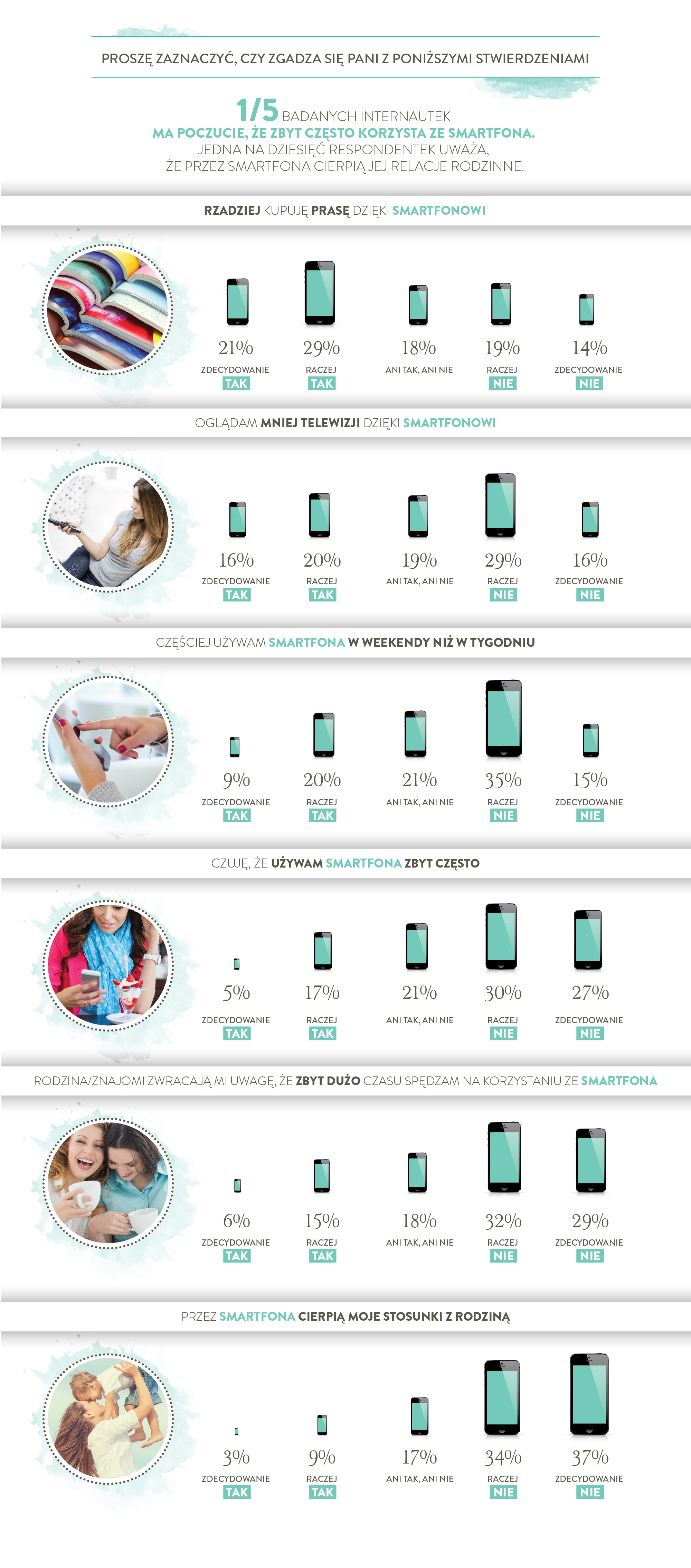 Polki zaczynają zauważać, że inteligentny telefon ma też swoją ciemną stronę. Potrafi uzależniać jak narkotyk i – przewrotnie – niszczyć relacje międzyludzkie. Jedna na pięć użytkowniczek smartfona przyznaje, że rodzina i znajomi zwracają uwagę na to, iż poświęca mu zbyt dużo czasu, a 12% ankietowanych jest zdania, że przez smartfon cierpią ich relacje rodzinne. Wyniki badania przeprowadzonego na zlecenie Westwing Home & Living dowodzą także, że niemal co 4 badana ma poczucie, że korzysta z urządzenia zbyt często.