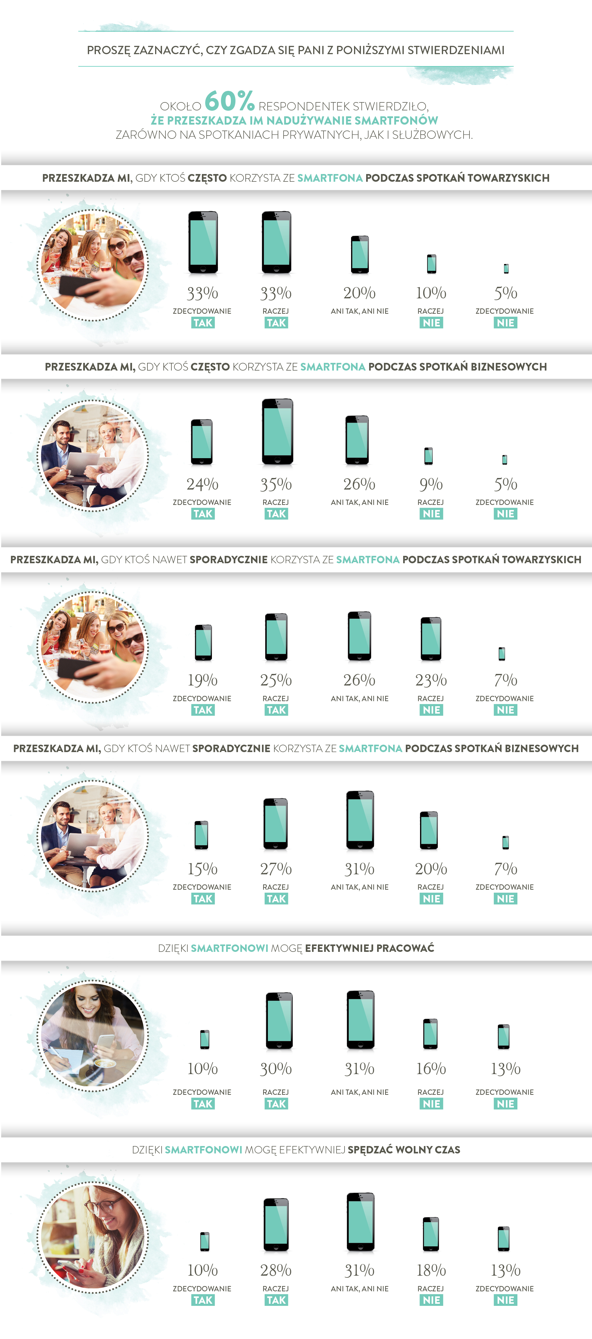 Polki traktują swój smartfon jak „przedłużenie ręki”. Jednocześnie wyniki badania przeprowadzonego na zlecenie Westwing Home & Living pokazują, że aż 7 na 10 posiadaczek smartfona denerwuje się, jak ich rozmówca zerka na telefon podczas spotkania towarzyskiego, a ponad połowa badanych (59%), gdy zdarza się to w trakcie spotkania o charakterze biznesowym. Co więcej, kobietom przeszkadza, gdy taka sytuacja ma miejsce nawet sporadycznie – przyznaje się do tego odpowiednio 44 i 42% badanych.
