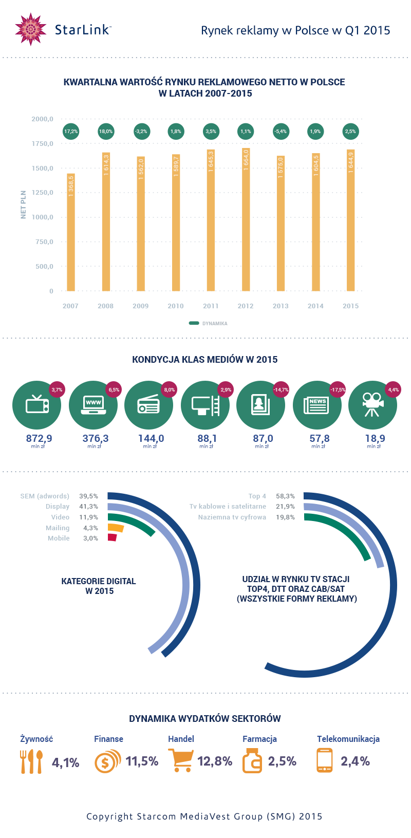 Telewizja. Według wyliczeń SMG Starlink przychody reklamowe w telewizji wzrosły w pierwszym kwartale o 3,7%, to jest o blisko 31 mln złotych wliczając w to wszystkie formy reklamy. Biorąc pod uwagę jedynie sprzedaż spotów reklamowych, przychody netto wzrosły o 4,4%. Do tak dobrego wyniku przyczyniły się wspomniane już budżety reklamowe farmacji rosnące w tempie 7% w okresie od stycznia do marca 2015r. Ponadto wydatki na reklamę telewizyjną zwiększały również sektory: żywność, handel, finanse, telekomunikacja i inne.