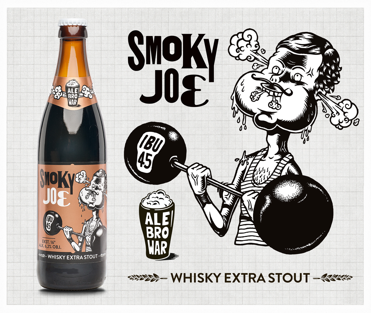 Rola Ostecx Créative, podobnie jak przy poprzednich siedmiu piwach z AleBrowaru, polegała na stworzeniu nazwy, wykonaniu ilustracji i finalnym projekcie etykiety. Smoky Joe stawi czoła rynkowej rzeczywistości w metalicznym PANTONIE 875 C, nawiązującym do koloru whisky.