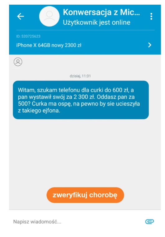 „Mam chorą córkę” to argument, którym często posługują się użytkownicy OLXa chcący przyspieszyć transakcję, wynegocjować ze sprzedającym korzystniejszą cenę lub wręcz skłonić go do oddania przedmiotu za darmo. Z tej okazji, OLX postanowił wprowadzić tzw. lekarza-bota, który sprawdzi czy użytkownicy naprawdę mają chorą córkę 😉
