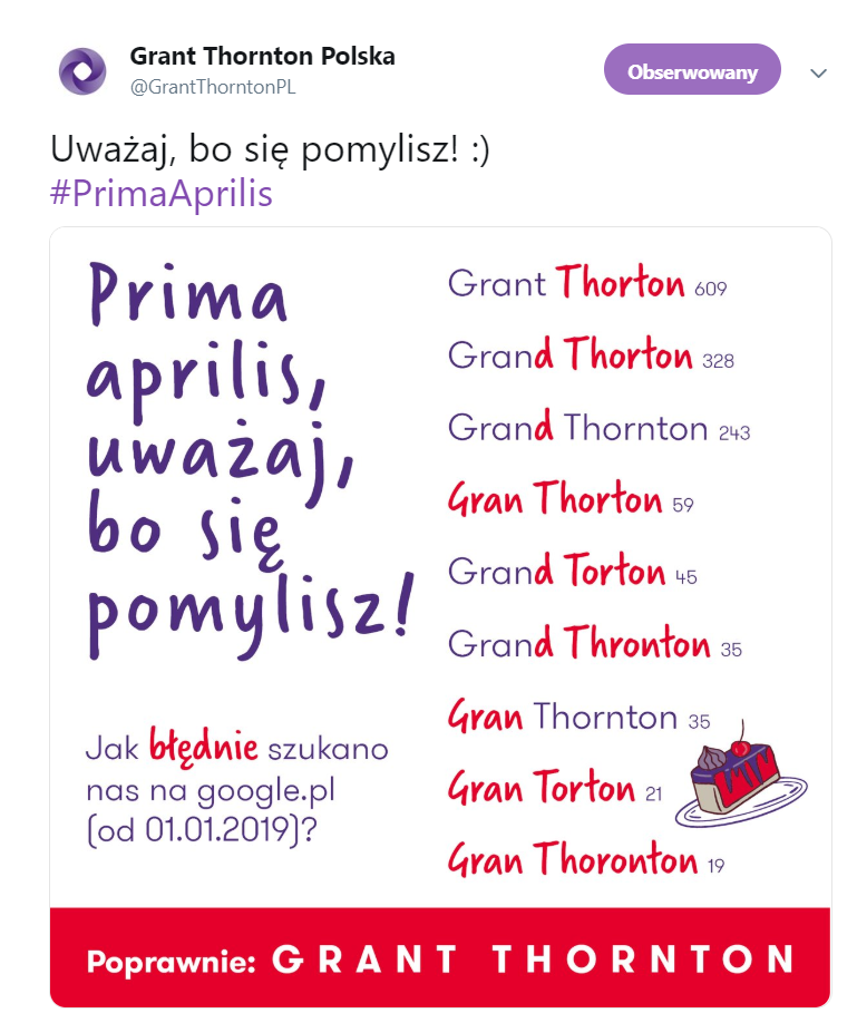 Firma Grant Thornton od lat zmaga się z problemem ze złą pisownią nazwy firmy. Nie chodzi tylko o wyszukiwania w Google’u, ale też o dziennikarzy, bo średnio około raz dziennie media źle piszą ich nazwę. W związku z tym, 1 kwietnia firma zamieściła na swoim Twittere grafikę, która rozwieje wszelkie wątpliwości, co do pisowni nazwy 😉