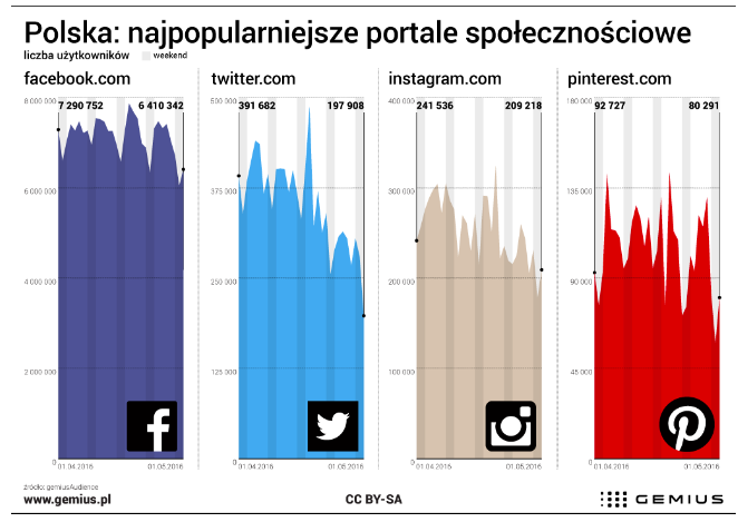 Wielka czwórka międzynarodowych serwisów social media w Polsce to: Facebook.com, Twitter.com, Instagram.com i Pinterest.com. Pierwszy z nich niepodzielnie wiedzie prym popularności na polskim rynku. Średnia dzienna liczba użytkowników Facebook.com w kwietniu 2016 roku wyniosła 7,14 mln i była dziesięciokrotnie wyższa od sumy średniej dziennej liczby użytkowników pozostałych trzech serwisów w tym samym okresie (Twitter.com – 353 tys., Instagram.com – 254 tys., Pinterest.com – 104 tys. użytkowników).