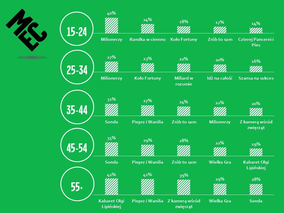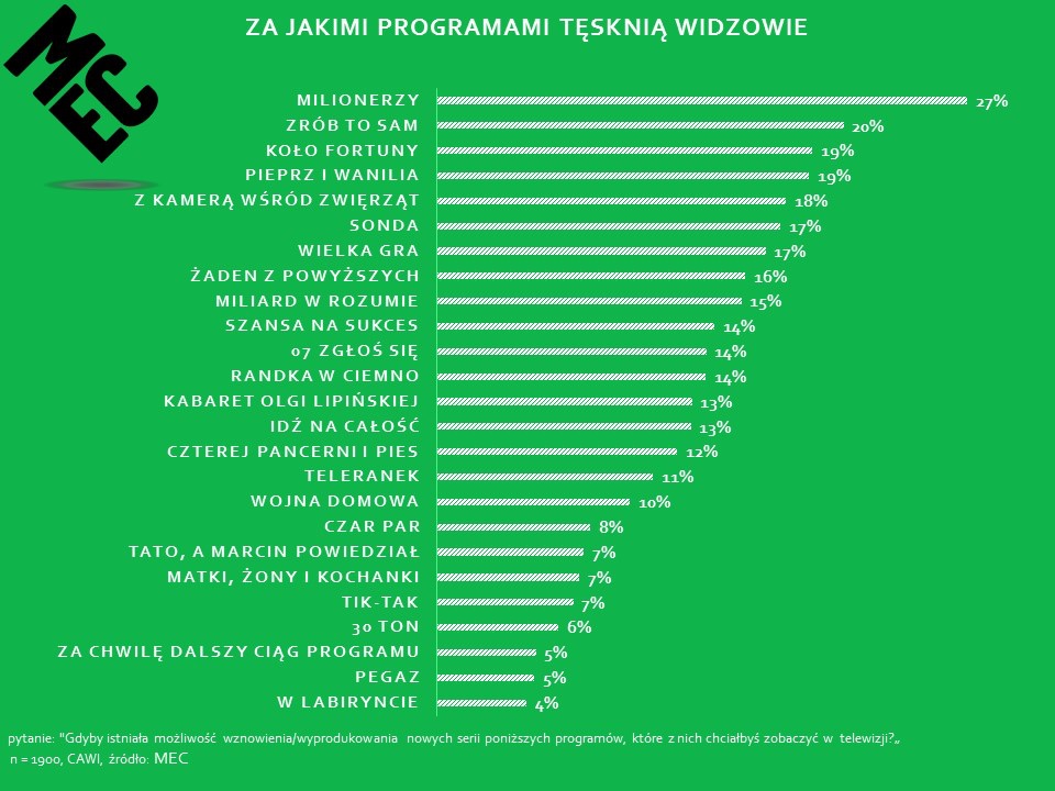 „Milionerzy”, „Zrób to sam” i „Koło fortuny” otwierają ranking programów, których reedycje lub nowe odcinki chętnie zobaczyliby polscy internauci powyżej 15 roku życia. Wśród badanych powyżej 35 roku życia czołówkę tworzą „Sonda”, „Pieprz i Wanilia” oraz „Kabaret Olgi Lipińskiej” – pokazało badanie MEC zrealizowane na grupie 2 tys. internautów. Projekt przebiegał dwuetapowo – w pierwszym internauci dostali krótką listę programów i proszeni byli o wpisanie własnych propozycji. Na bazie ich propozycji MEC skonstruował pełniejszą listę i trafiła ona do badania na próbie 1,9 tys. internautów.
