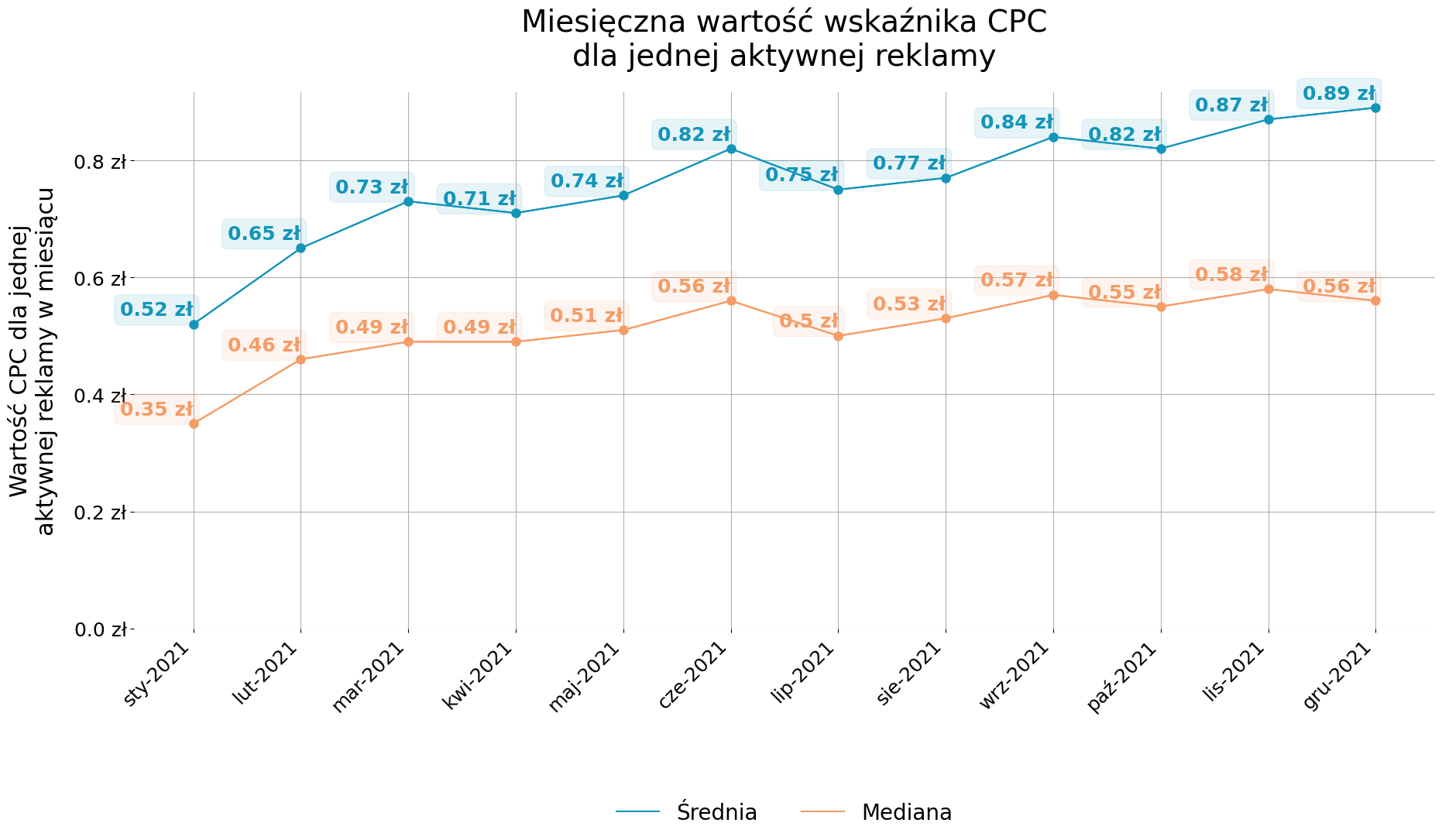Z analizy Sotrendera wynika, że średnia wartość wskaźnika CPC dla reklam na Facebooku i Instagramie w 2021 roku wynosiła 72 gr. Stosunkowo tani, pod kątem kosztów za kliknięcie, był początek roku, zaś najwyższe wartości wskaźnik osiągnął w listopadzie i grudniu. Było to odpowiednio 87 i 89 gr.