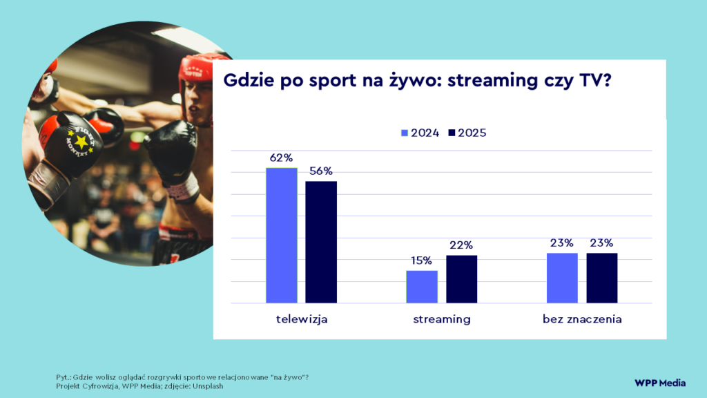 W 2024 r. blisko 2/3 widzów preferowało oglądanie sportu w telewizji. W 2025 r. telewizja traci część przewagi – co czwarty widz wybiera streaming jako medium do śledzenia rozgrywek na żywo.