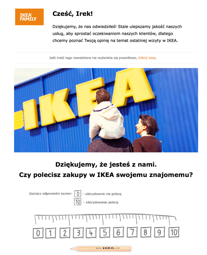 Newsletter z ankietą badającą poziom satysfakcji klienta. Poziom satysfakcji możesz oznaczyć w systemie za pomocą punktów scoringowych lub tagów.