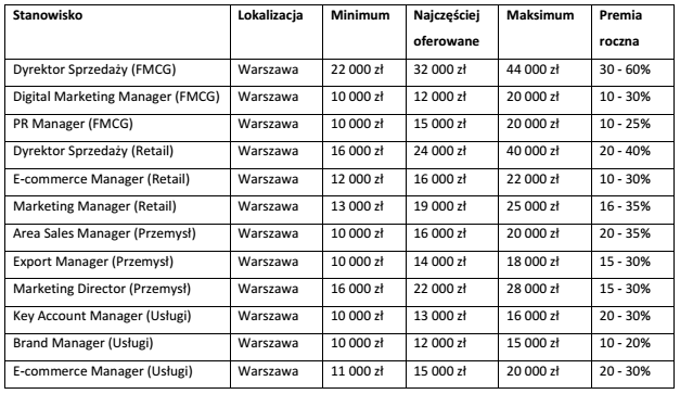 Tabela nr 1.: Aktualne miesięczne zarobki brutto wybrane z Przeglądu Wynagrodzeń 2013/2014 Michael Page w Sprzedaży i Marketingu.