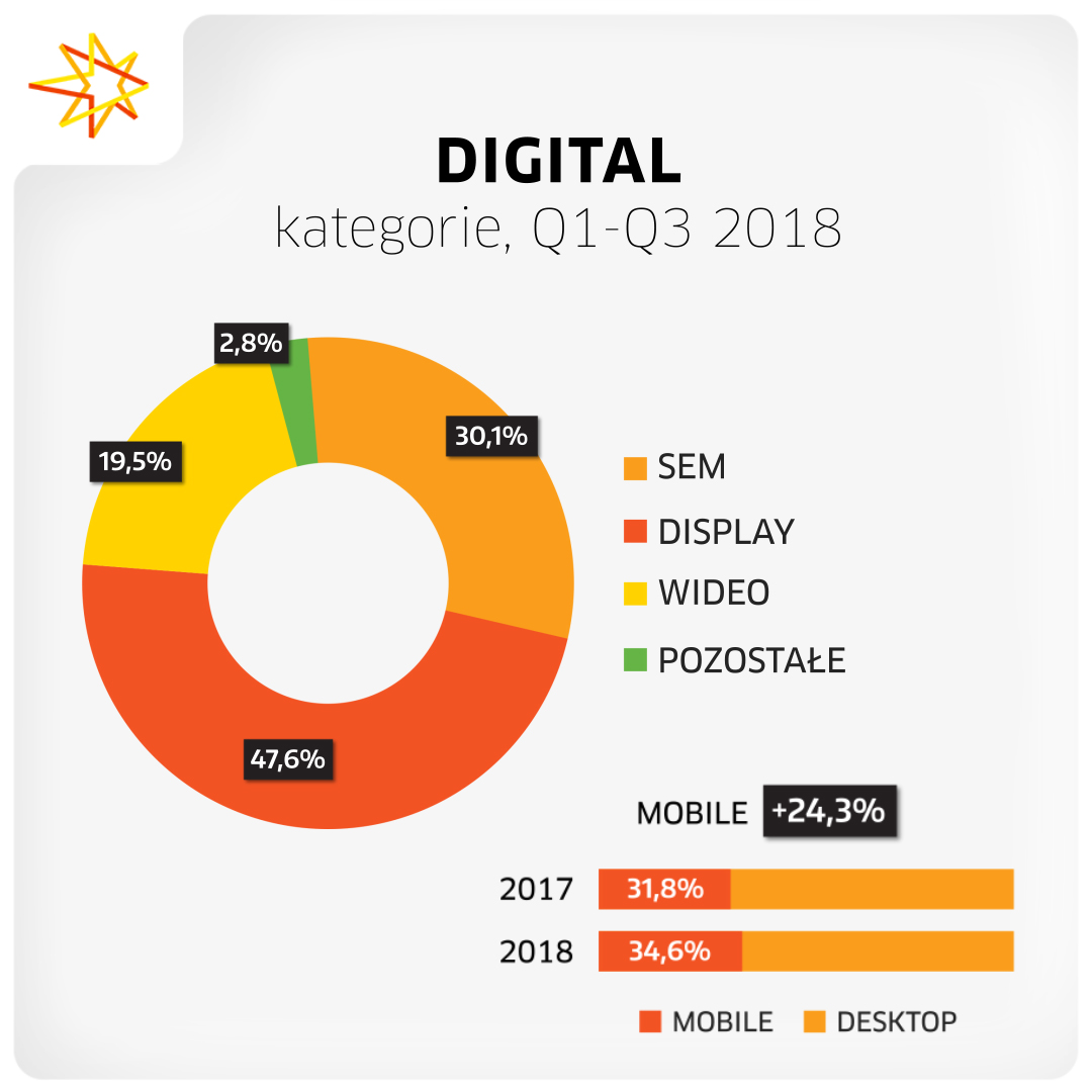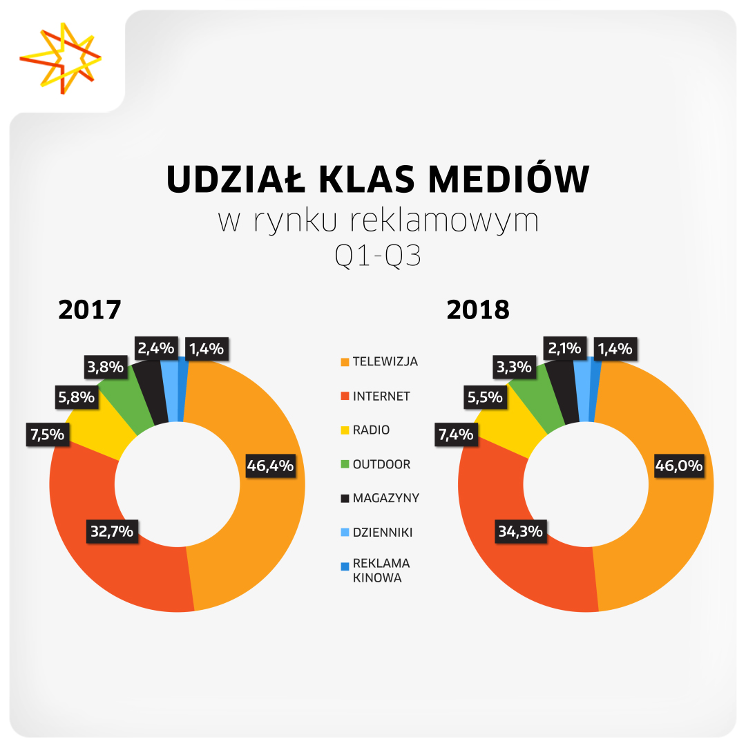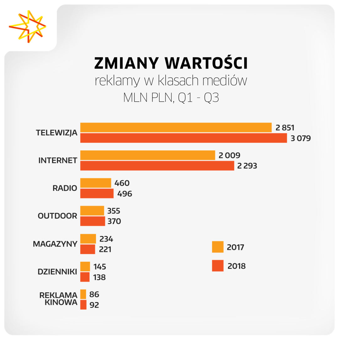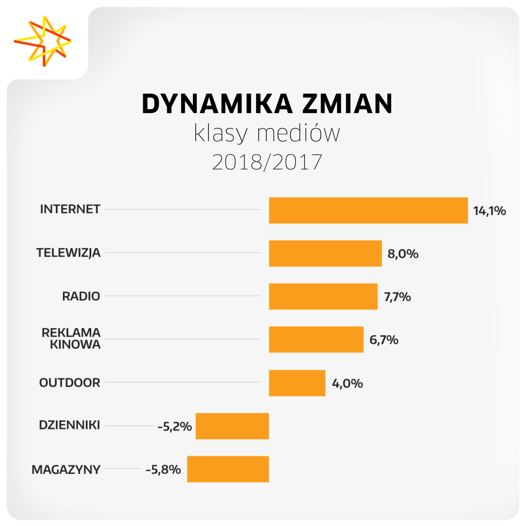 Po trzech kwartałach 2018 r. wzrost zanotowały wszystkie klasy mediów z wyjątkiem prasy. Zdecydowanym liderem była reklama internetowa, która wygenerowała o 14,1% wyższe budżety. Wzrosty zanotowały także: telewizja (+8,0%), radio (+7,7%), reklama kinowa (+6,7%) oraz reklama zewnętrzna (+4,0%). Traciły jedynie magazyny i gazety. Pierwszy raz od kilku lat wydatki na reklamę w magazynach spadały mocniej niż wydatki w gazetach. Dynamiki wyniosły odpowiednio -5,8% oraz -5,2%.