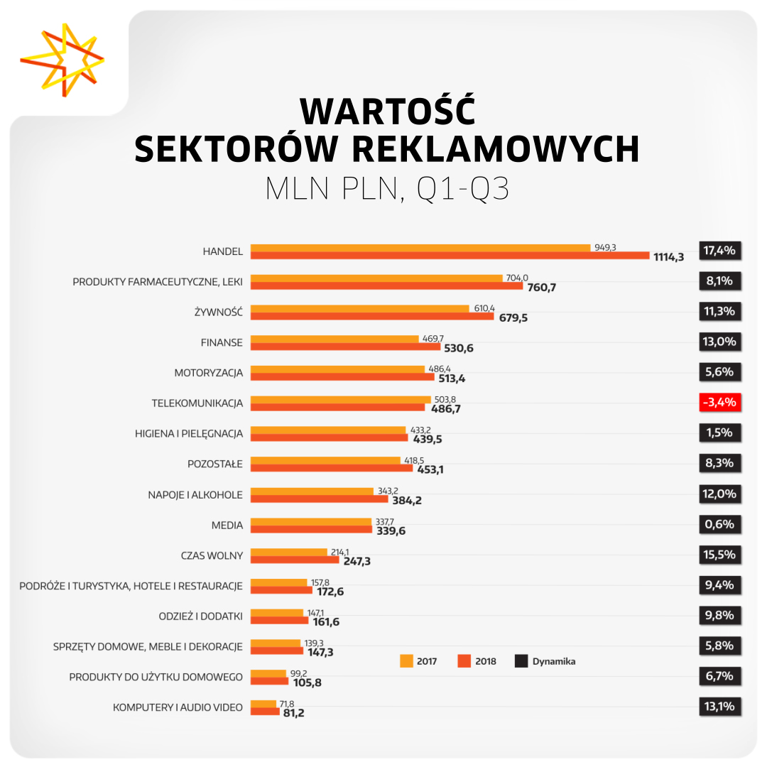 Oprócz handlu wyróżniły się jeszcze trzy inne sektory – finanse (+61 mln zł, dynamika +13%), żywność (+69,1 mln zł, +11,3%), produkty farmaceutyczne i leki (+56,8 mln zł, dynamika +8,1%). W pierwszym przypadku za wzrost odpowiedzialne był wydatki banków PKO BP oraz Alior Bank. W związku z kampanią rebrandingową w trzecim kwartale dużo wydawał także Santander Bank Polska. W branży farmaceutycznej swoje działania marketingowe mocno zintensyfikowały Natur Produkt Zdrovit oraz Sandoz, zaś w sektorze spożywczym za wzrosty odpowiadały m. in. Ferrero, Wawel Kraków oraz Mars.