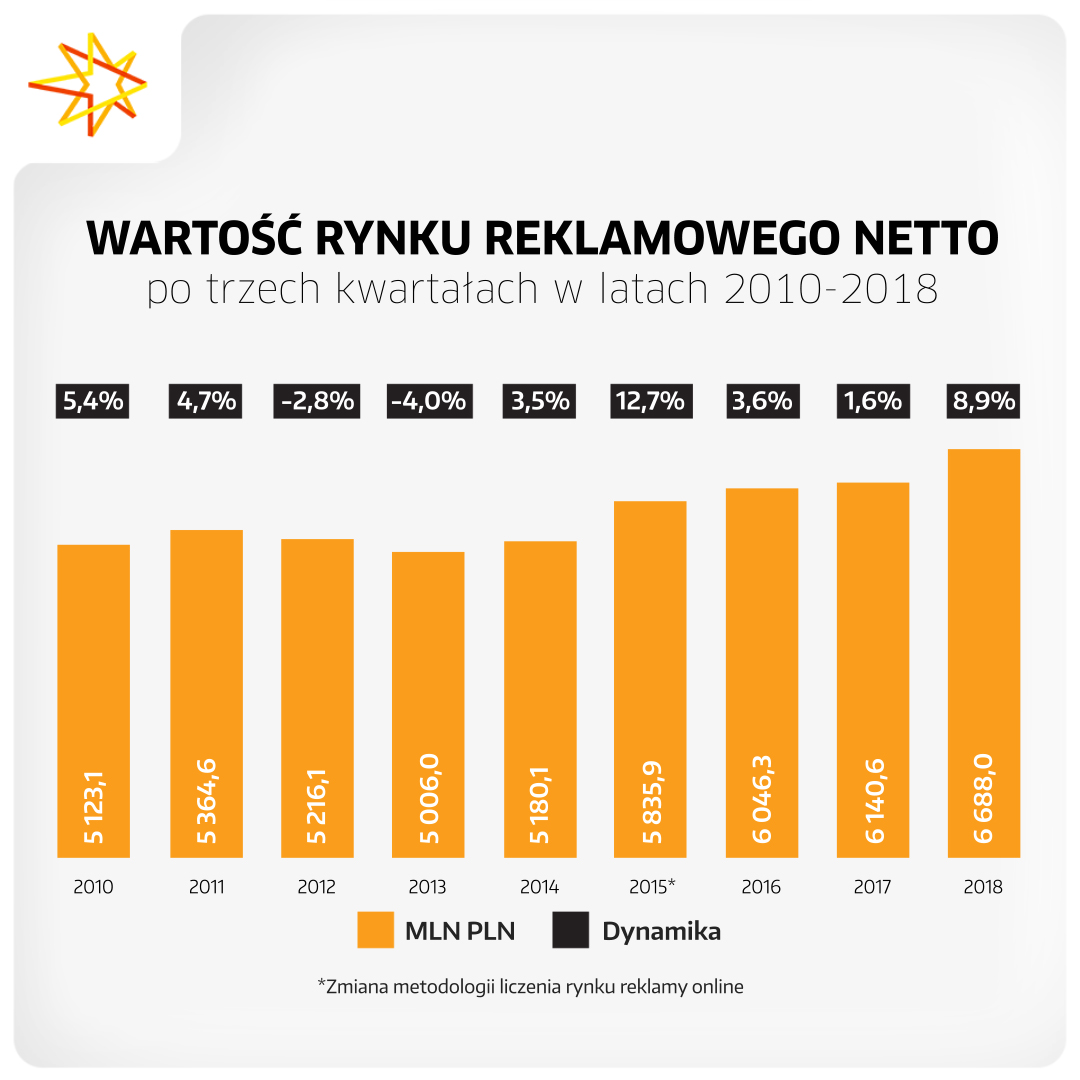 Po trzech kwartałach 2018 r. wzrost zanotowały wszystkie klasy mediów z wyjątkiem prasy. Zdecydowanym liderem była reklama internetowa, która wygenerowała o 14,1% wyższe budżety. Wzrosty zanotowały także: telewizja (+8,0%), radio (+7,7%), reklama kinowa (+6,7%) oraz reklama zewnętrzna (+4,0%). Traciły jedynie magazyny i gazety. Pierwszy raz od kilku lat wydatki na reklamę w magazynach spadały mocniej niż wydatki w gazetach. Dynamiki wyniosły odpowiednio -5,8% oraz -5,2%.