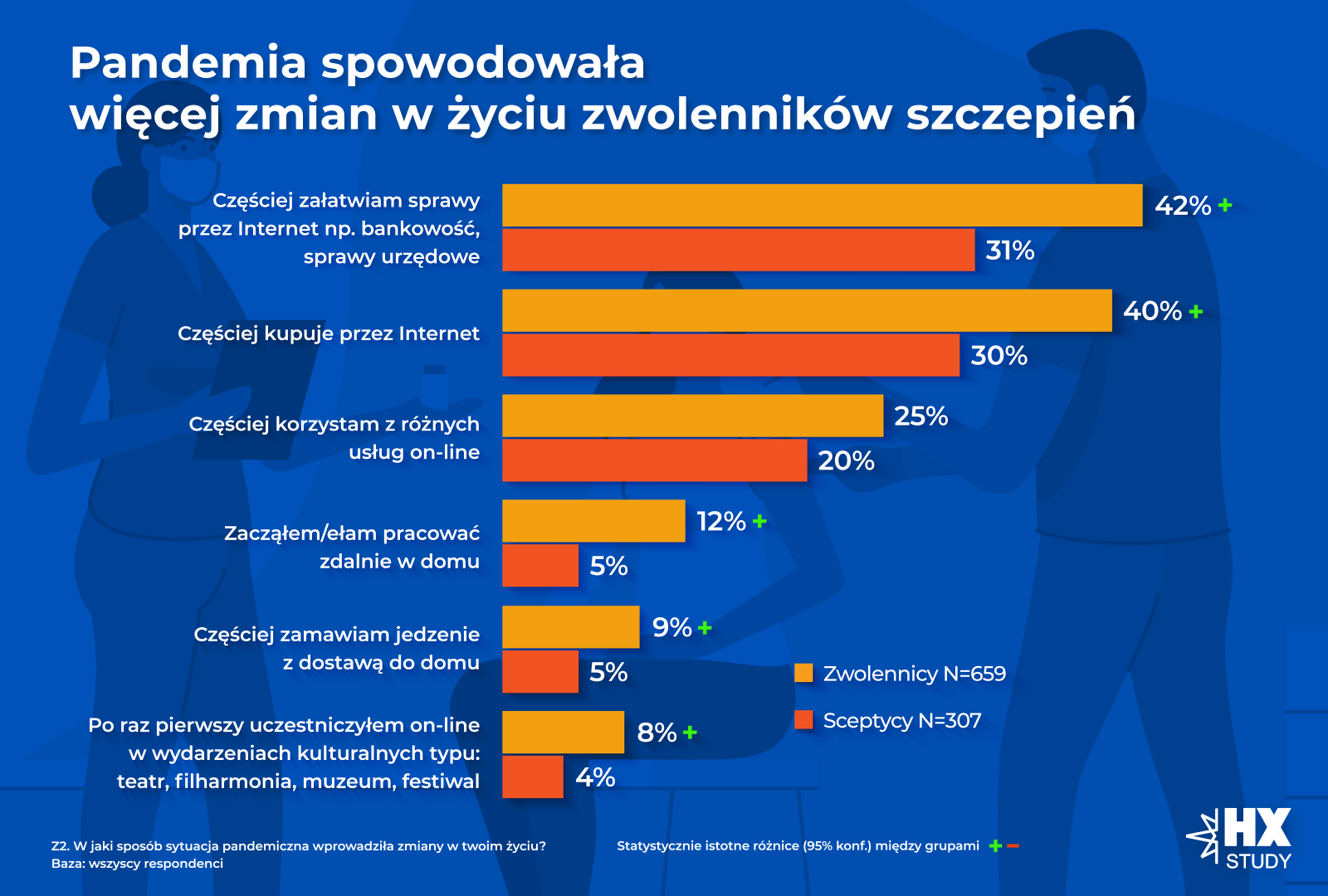 Co więcej, zwolennicy szczepień to osoby, które częściej niż sceptycy, wyraźnie zmienili swoją codzienność w efekcie pandemii – i nie chodzi wyłącznie o zmiany negatywne, ale również o robienie zakupów online czy pracę zdalną. Oznacza to, że odczuli pandemię na własnej skórze i prawdopodobnie również dlatego, są bardziej otwarci na szczepienia.