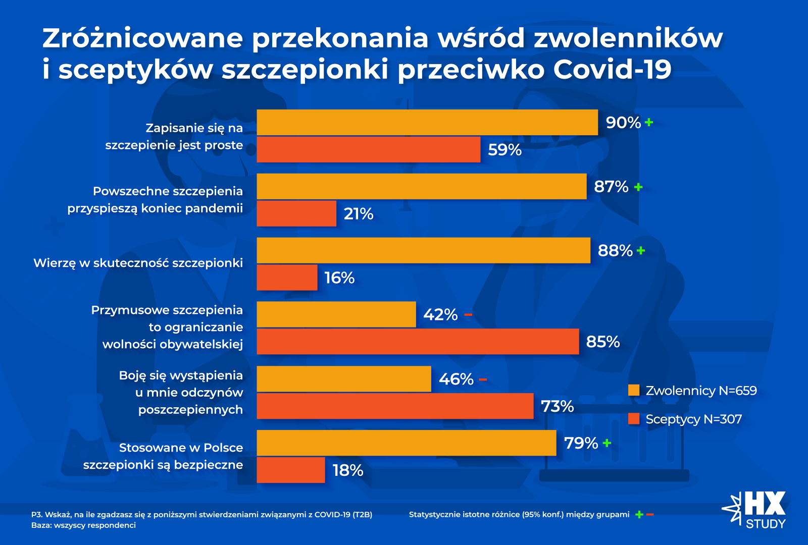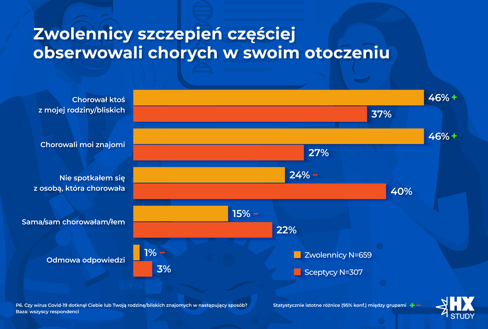 – Skoro istotnym czynnikiem determinującym postawę wobec szczepień jest egoistyczna troska o siebie samego, jak również skala zmian, jaka zaszła w życiu w trakcie pandemii, nie dziwi nas fakt, że zwolenników szczepień od sceptyków różnicuje również kwestia osobistych doświadczeń związanych z COVID-19. Wśród zwolenników szczepień więcej jest osób, które obserwowały chorych w swoim otoczeniu, z ofiarami śmiertelnymi włącznie. W grupie sceptycznie nastawionej do szczepień więcej osób deklaruje, że nie zna nikogo, kto chorował. Z drugiej strony, to właśnie w grupie sceptyków więcej jest ozdrowieńców, którzy mogą czuć się tymczasowo odporni. Fuzja tych czynników może więc osłabiać poczucie osobistego zagrożenia, które jest kluczowym determinantem decyzji o szczepieniu – mówi Jędrasik.