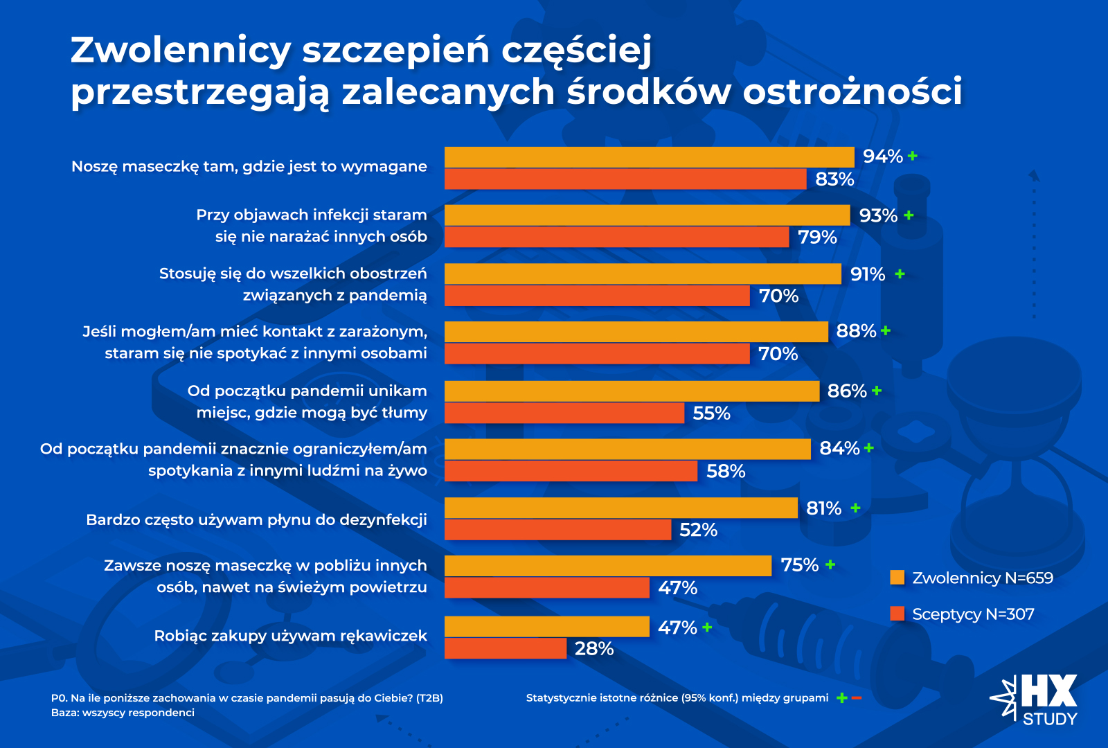 Z badania wynika również, że stosunek do szczepień przekłada się na postrzeganie ograniczeń spowodowanych sytuacją pandemiczną. Widać wyraźną korelację pomiędzy decyzją „szczepić się czy nie” a respektowaniem obostrzeń, takich jak np. noszenie maseczek, unikanie tłumów. Pomimo różnic, wydajemy się być bardzo zdyscyplinowanym społeczeństwem, przynajmniej deklaratywnie.