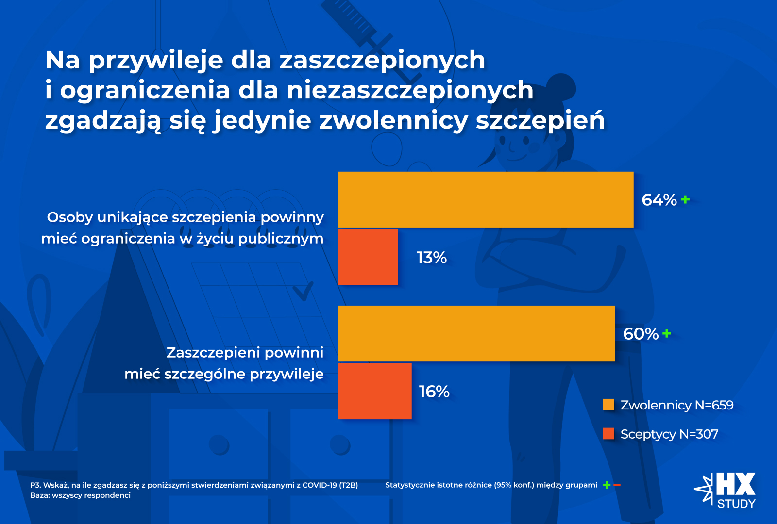 – W dyskursie społecznym coraz częściej pojawiają się sugestie, że osoby zaszczepione będą cieszyć się dodatkowymi przywilejami. Interesowało nas więc zagadnienie, czy wprowadzanie specjalnych uprawnień dla osób zaszczepionych lub ograniczeń dla osób bez szczepienia, spotkałoby się z aprobatą Polaków. Obserwujemy dużą polaryzację opinii. Osoby zaszczepione częściej wskazują zasadność takich działań, podczas gdy sceptycy nie zgadzają się na różne traktowanie w przestrzeni publicznej. Gdy jednak przechodzimy do konkretnych propozycji, które mogłyby podzielić Polaków w przestrzeni publicznej na lepszych (szczepionych) i gorszych (nieszczepionych), wtedy możemy się już spodziewać dużego oporu – komentuje Jędrasik.