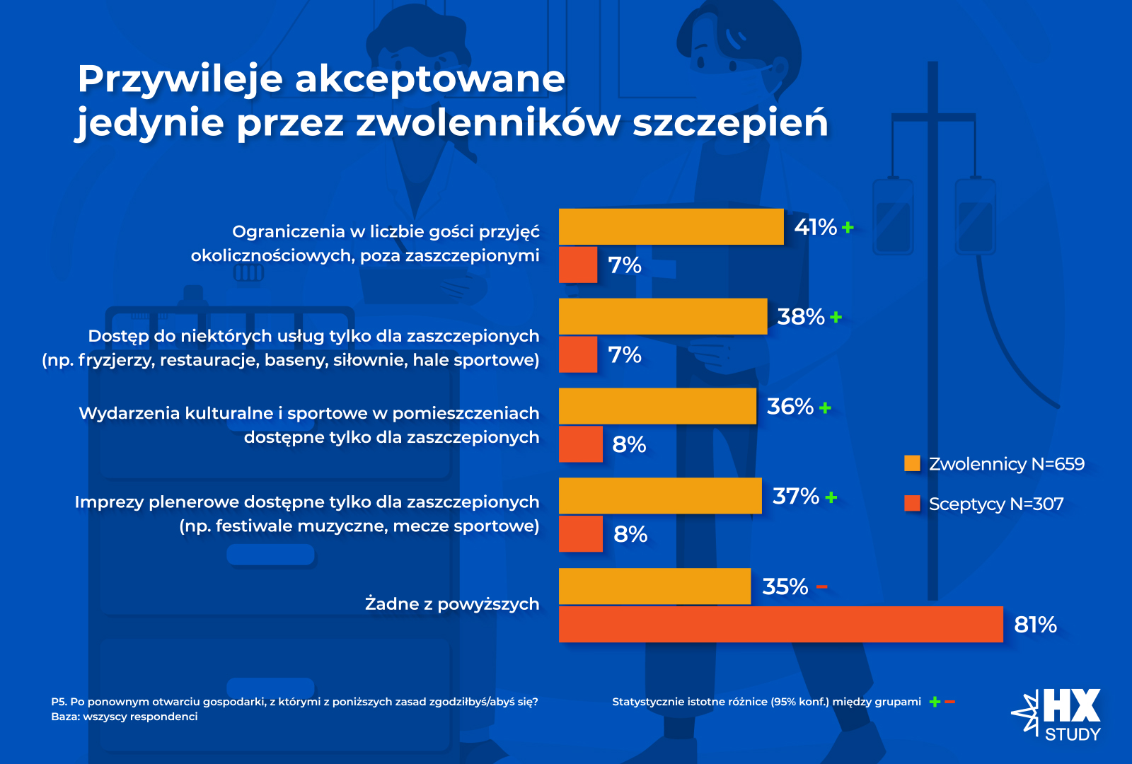 Konkretne rozwiązania wprowadzane przez niektóre kraje i regulujące dostęp np. do usług fryzjerskich, wydarzeń kulturalnych itp., spotkałyby się w Polsce z umiarkowanym entuzjazmem. Zwolennicy są przychylniejsi takim rozwiązaniom, ale poziom poparcia sięga maksymalnie 40%. Można się spodziewać, że wprowadzenie tego typu regulacji i tak nie przekonałoby przeciwników szczepień, a wywołałoby sprzeciw wobec nierówności i ograniczaniu wolności. Pierwsze próby takich działań, jak np. specjalna kolejka dla zaszczepionych do basenów w Termach Poznańskich, pokazują, że zagadnienie należy do kontrowersyjnych i wywołujących żywiołowe reakcje.