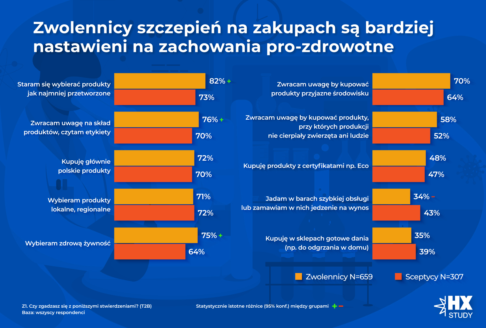 Polacy w swoich deklaracjach są świadomymi konsumentami. Czytają etykiety, starają się wybierać zdrową żywność. – Gdyby deklarowane procenty wskazań miały przełożenie na półkę sklepową, to ¾ sklepów zajmowałaby zdrowa, certyfikowana i nieprzetworzona żywność. Poziomy wskazań pokazują zatem raczej życzeniowe spojrzenie na siebie jako na konsumenta. Czy jednak grupa sceptycznie nastawiona do szczepienia jest również bardziej ostrożna w wyborze tego, co znajdzie się na jej talerzu? Tak mogłaby sugerować, często obecna w narracji sceptyków, naturalność i dbałość o zdrowie. Okazuje się jednak, że jest dokładnie odwrotnie. Większy odsetek zachowań prozdrowotnych i proekologicznych znajdziemy wśród zwolenników szczepień. Racjonalna argumentacja, stojąca za odmową szczepienia nie przekłada się na racjonalny wybór konsumencki – mówi Jędrasik.