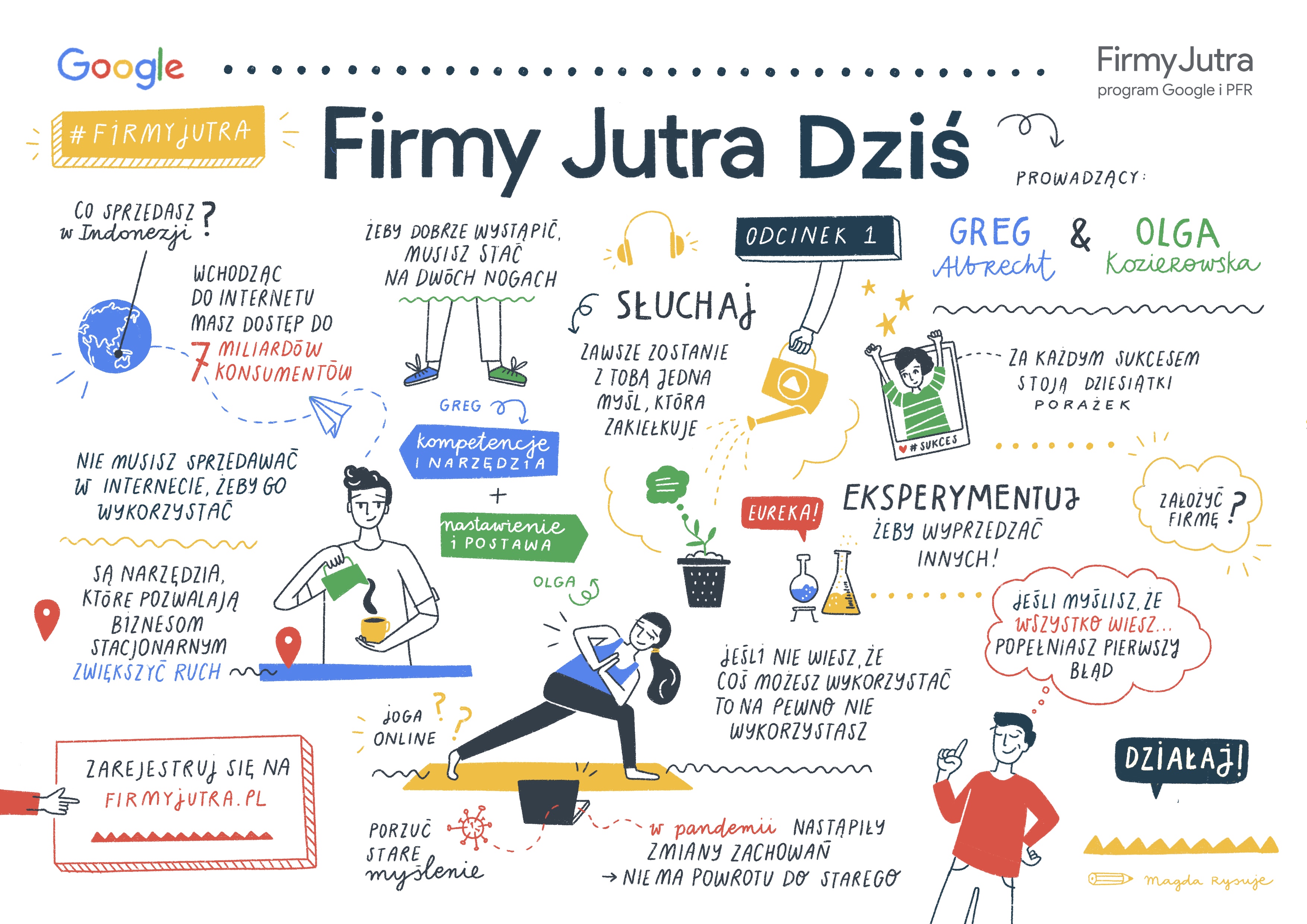 Podcast Firmy Jutra Dziś jest już dostępny na Google Podcasts, Spotify oraz Apple Podcasts. Nowe odcinki podcastu będą pojawiać się w każdy wtorek. Dodatkowo na stronie firmyjutra.pl znajdują się notatki graficzne do każdego odcinka, które można czytać z dowolnego punktu i które ułatwią zapamiętanie najważniejszych myśli i inspiracji.