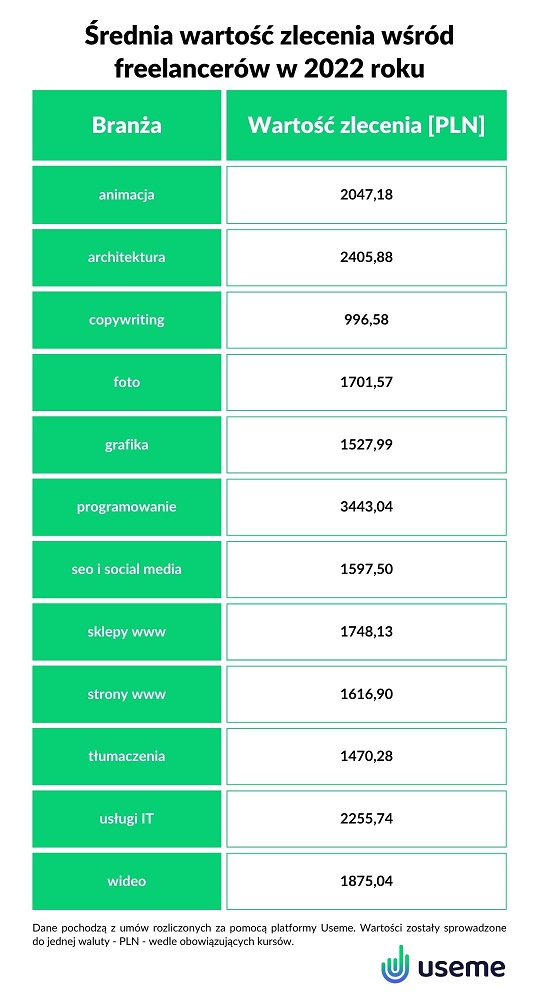 Useme, platforma dla freelancerów oraz zleceniodawców, po raz kolejny podzieliło się średnimi wysokościami stawek za zlecenia w najpopularniejszych wśród polskich freelancerów profesjach. Zaprezentowane w najnowszym raporcie dane pokazują, że sytuacja gospodarcza, a także wzrost popularności współpracy z wolnymi strzelcami wpłynęły na popyt i cenę za świadczone przez nich usługi.