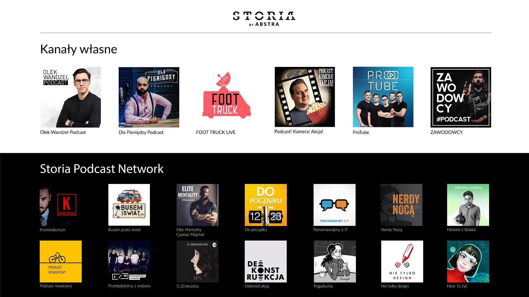 W ramach platformy Storia Podcast Network będzie funkcjonować 14 podcastów, wpisujących się aż w 12 różnorodnych segmentów tematycznych, uwzględniających m.in. lifestyle, sport, finanse i popkulturę. Storia by Abstra udziela wsparcia zarówno najpopularniejszym podcastom w Polsce, takim jak „Kryminatorium”, „Porozmawiajmy o IT” i „Nerdy nocą”, jak również tym perspektywicznym, które już prezentują bardzo wysoką jakość, m.in. „Przedsiębiorcom z wyboru”, „O zmierzchu” lub „Podcastowi rowerowemu”.