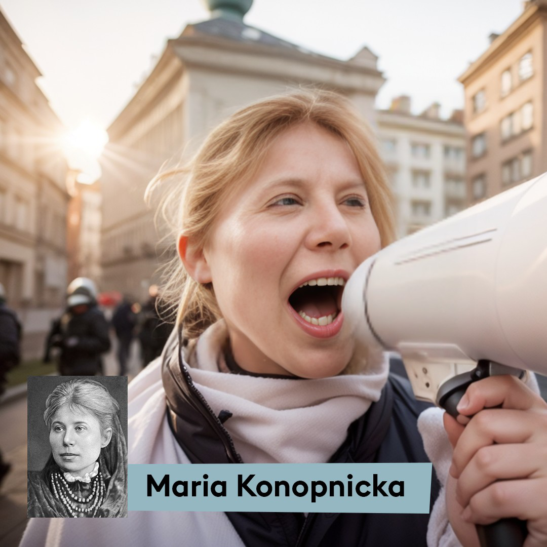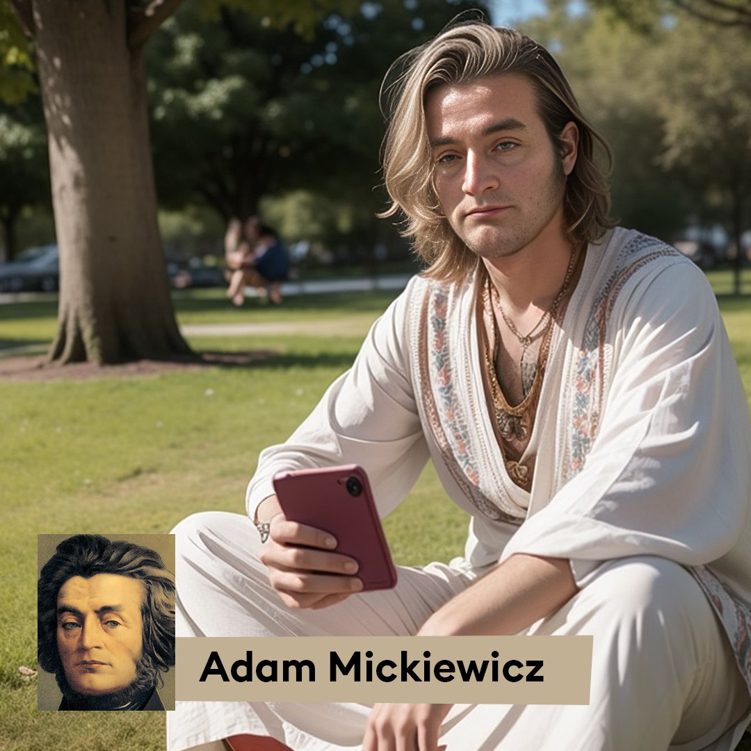 Przykładowo, Adam Mickiewicz został przedstawiony na grafice w nieco romantycznym klimacie. Widzimy go z rozwianymi dłuższymi włosami, ubranego w modną, białą koszulę, spędzającego czas w parku, gdzie być może poszukuje inspiracji do swoich dzieł. Maria Konopnicka z kolei, została wygenerowana jako aktywistka, trzymająca megafon w ręku, bywalczyni demonstracji. To odzwierciedla jej zaangażowanie społeczne oraz idee i wartości przekazywane w dziełach.