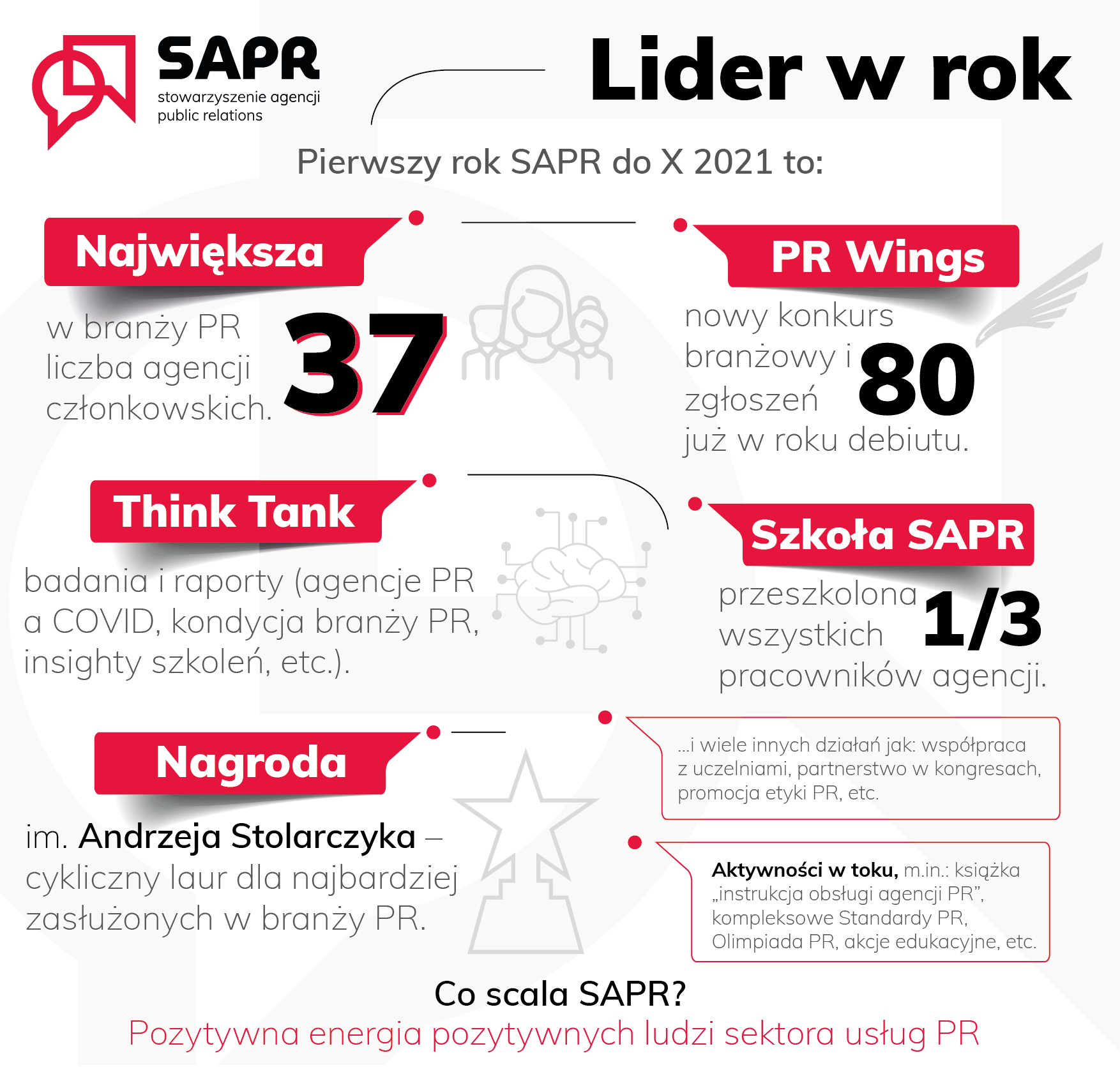 Przykładem takich ogólnobranżowych inicjatyw SAPR jest nowy konkurs w polskim świecie public relations – PR Wings, który zadebiutował w drugiej połowie 2021 r. – Konkurs ten w zaledwie miesiąc od ogłoszenia zgromadził aż 80 zgłoszeń, co nie zdarzyło się jeszcze nigdy w pierwszej edycji jakiegokolwiek konkursu branży PR w Polsce. Wiem dobrze z doświadczenia, że taki odzew rynku zajmował zazwyczaj kilka lat budowania rozpoznawalności konkursu – powiedział Paweł Trochimiuk, wiceprezes SAPR. – To dowód na to, że polska branża PR bardzo potrzebuje konkursu, który realnie łączy atrybuty dostępności, wiarygodności i prestiżu. Będziemy tych atrybutów bardzo pilnować, bo właśnie one gwarantują rozwój tej inicjatywy w latach następnych – dodał Trochimiuk.