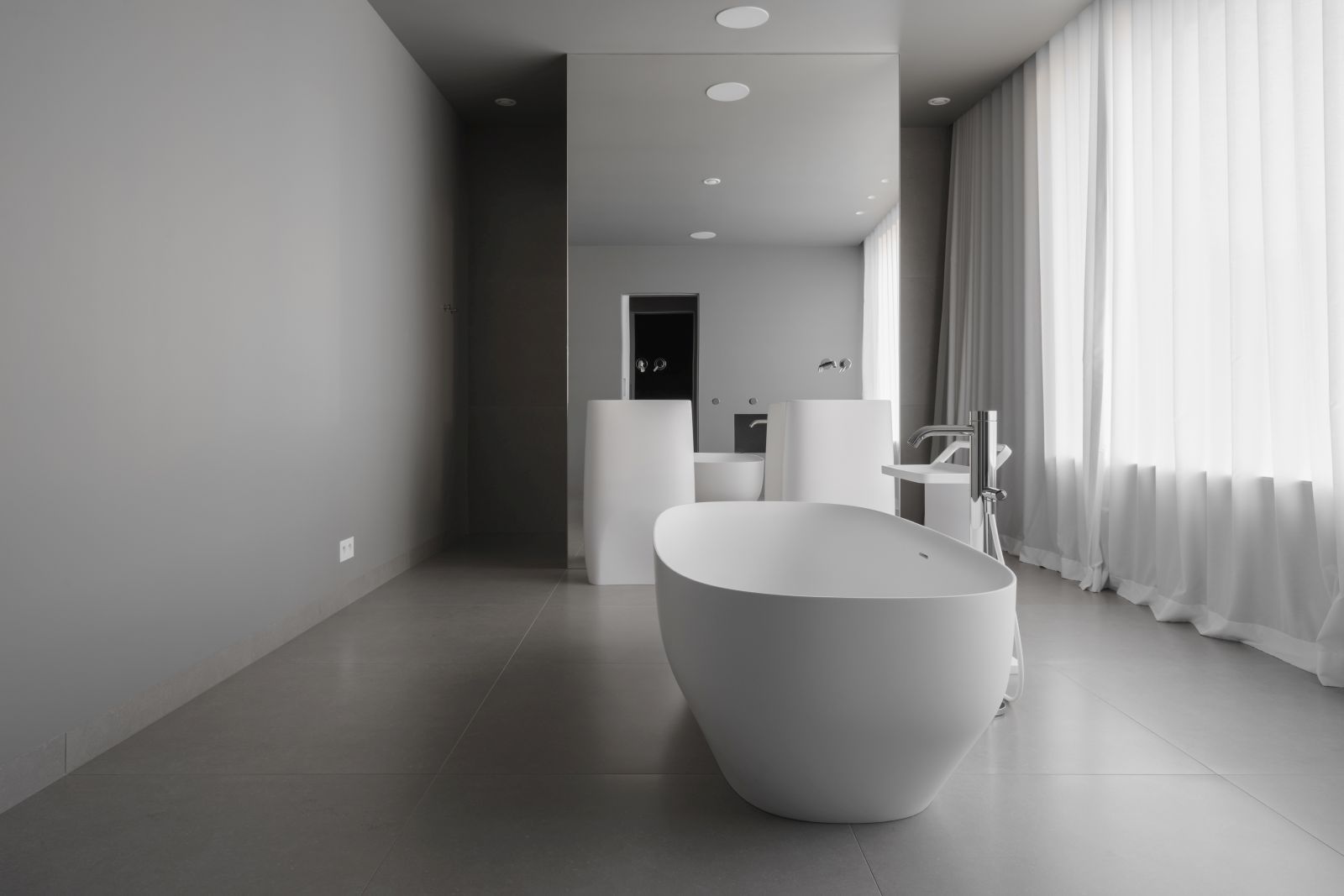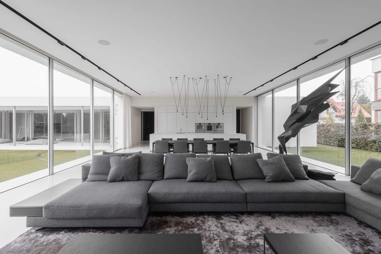 Jak twierdzą projektanci z pracowni PULVA wnętrza tego domu to czystość form, przestrzeń artystyczna, minimalna ilość komunikatów i skupienie na detalu. Zastosowane w nim wyposażenie bazuje na ikonach włoskiego designu. Obok bardzo technicznych produktów Rimadesio [drzwi, stół] swoje miejsce znalazły takie marki jak Minotti [kanapa salon], Living Divani [łóżko, kanapa w sypialni], Porro i Poliform [garderoby], Bulthaup [kuchnia]. Całość aranżacji dopełnia również sztuka w postaci obrazów namalowanych przez Katarzynę Zygaldewicz oraz rzeźb Tomasza Górnickiego