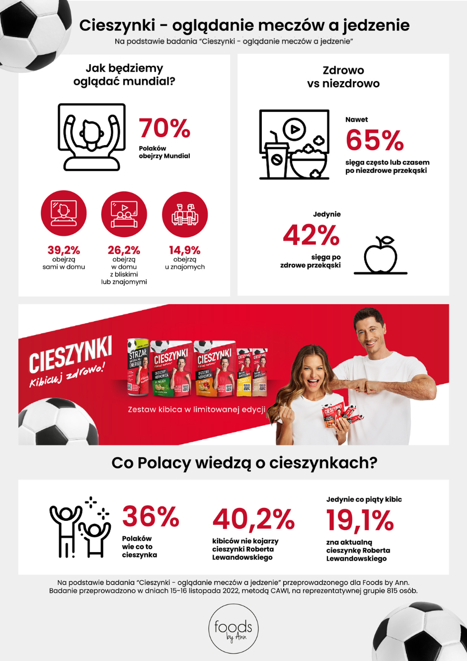 * Na podstawie badania „Cieszynki – oglądanie meczów a jedzenie” przeprowadzonego dla Foods by Ann. Badanie przeprowadzono w dniach 15-16 listopada 2022, metodą CAWI, na reprezentatywnej grupie 815 osób.