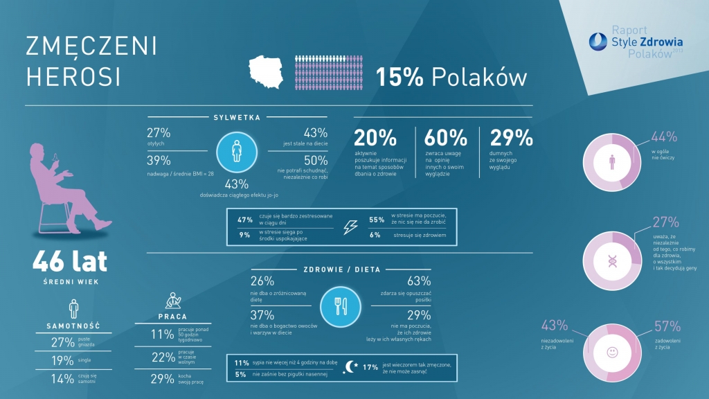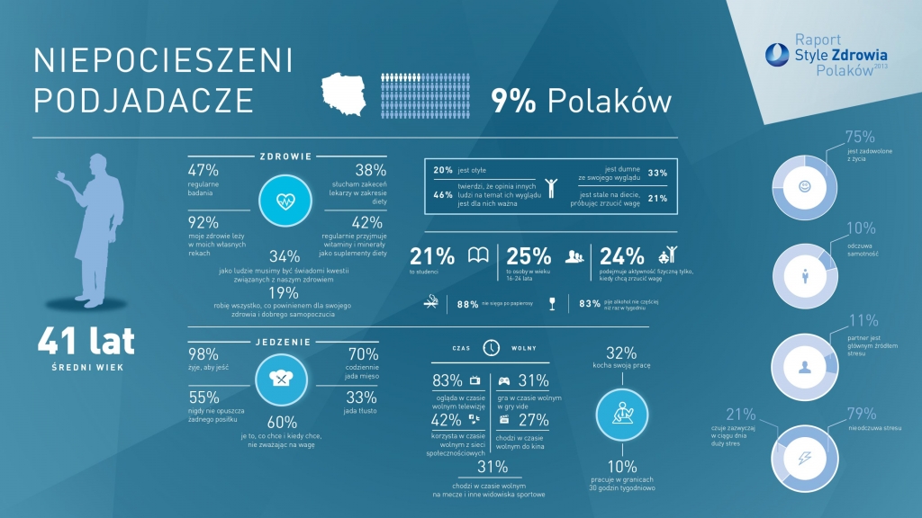 Wyniki badania „USP Zdrowie – Style Zdrowia Polaków 2013” wskazują, że zdrowotna świadomość Polaków jest wysoka, jednak nie przekłada się na ich zachowania. 80% Polaków rozumie jak istotne dla zdrowia jest regularne odżywianie i aktywność fizyczna (83%), jednak tylko co dwudziesty deklaruje, że wykonuje ćwiczenia fizyczne, a mniej niż połowa przyznaje, że je regularnie. Niepokojący może być fakt, iż 97% badanych przyznało, że na co dzień odczuwa stres, a za jego główne przyczyny podało pracę i naukę (30%) oraz pieniądze i opłaty (38%). Bardziej optymistyczne dane wskazują, że 2/3 Polaków odczuwa zadowolenie ze swojego życia, a 82% z nich uważa, że nasze zdrowie leży w naszych własnych rękach.