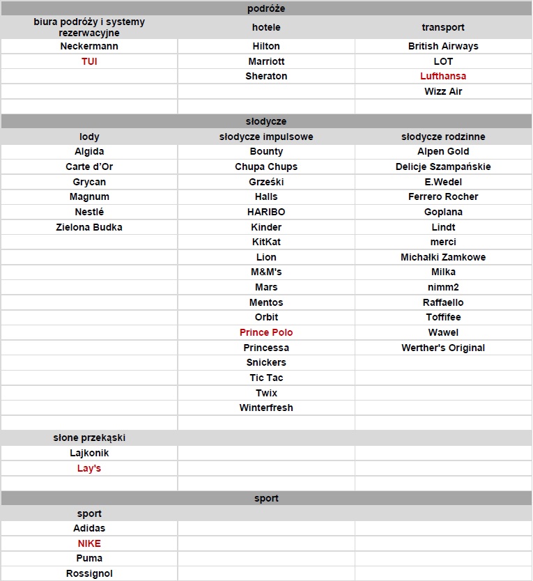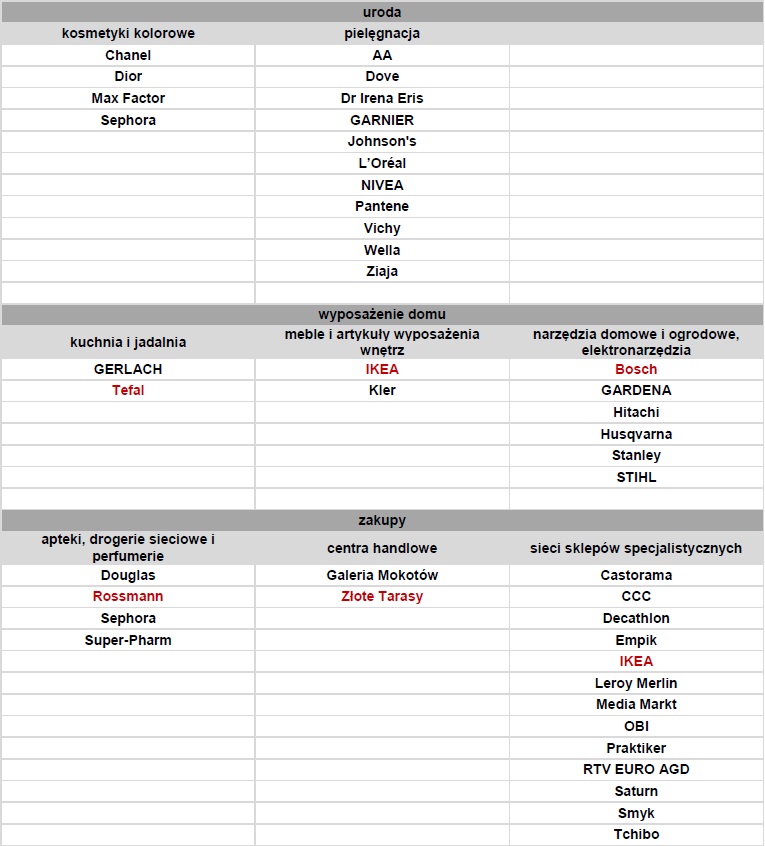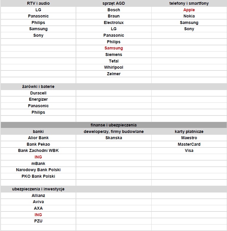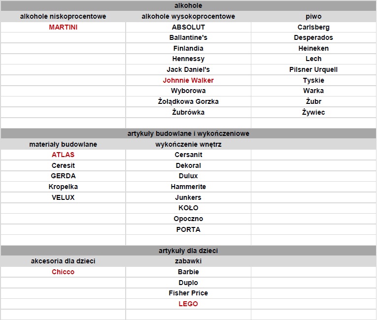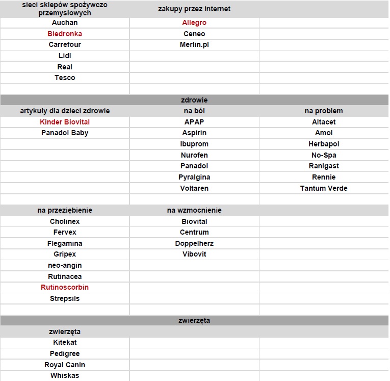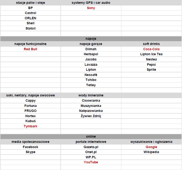 * kolorem czerwonym oznaczono marki, które uzyskały znaczącą przewagę w swojej kategorii