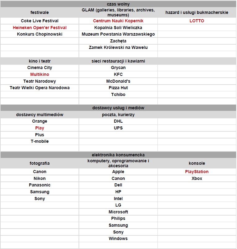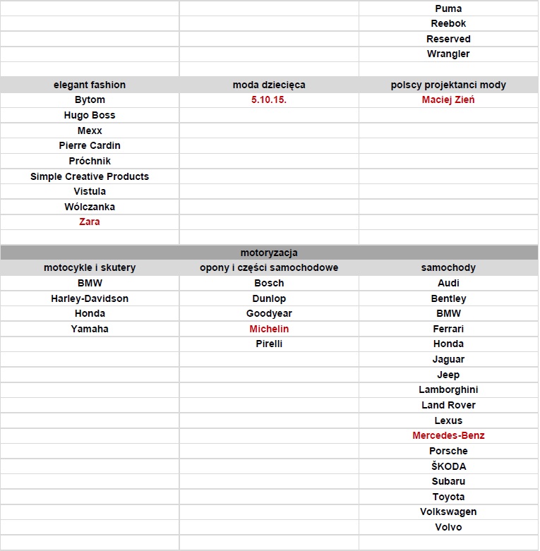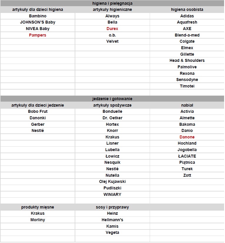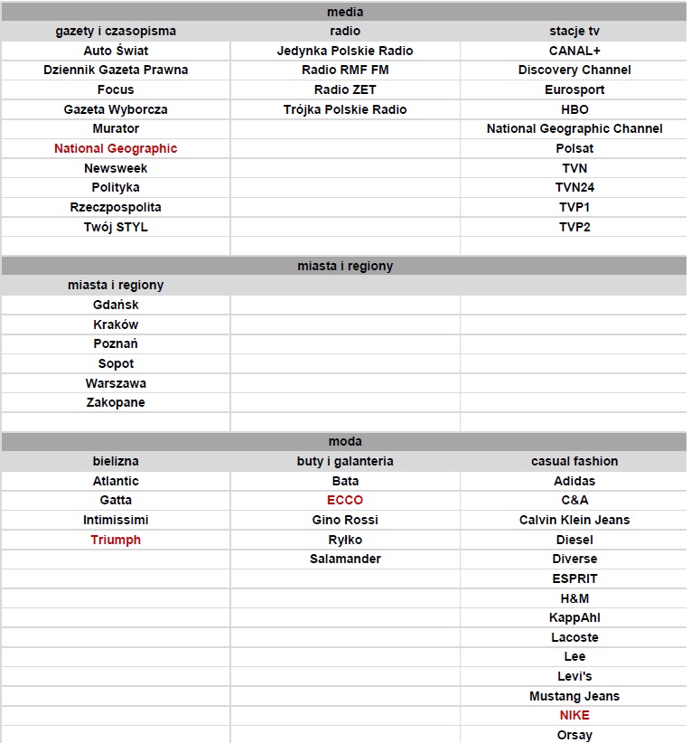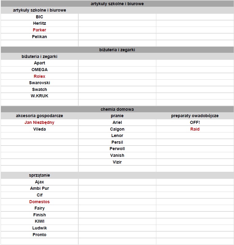 * kolorem czerwonym oznaczono marki, które uzyskały znaczącą przewagę w swojej kategorii