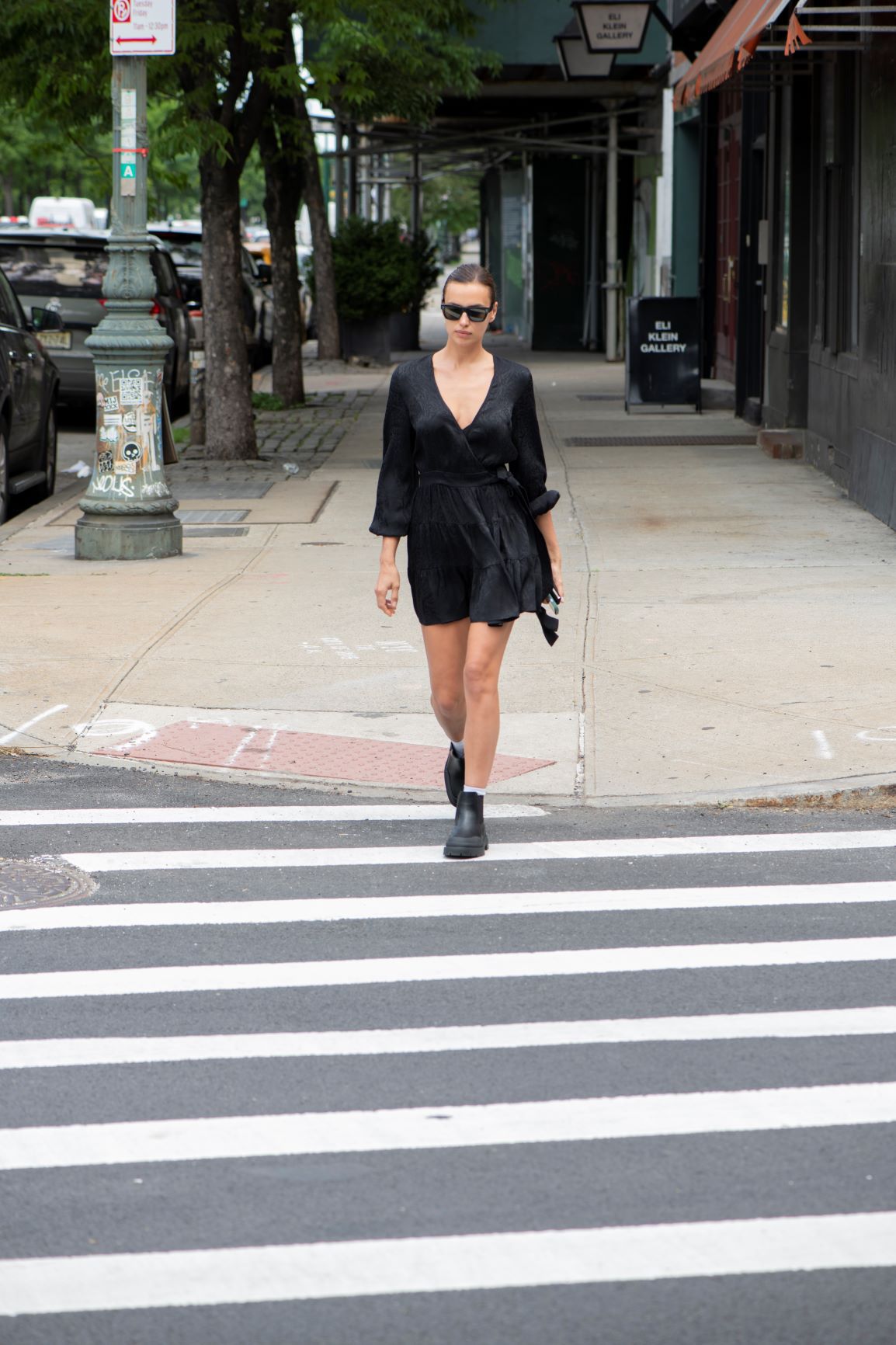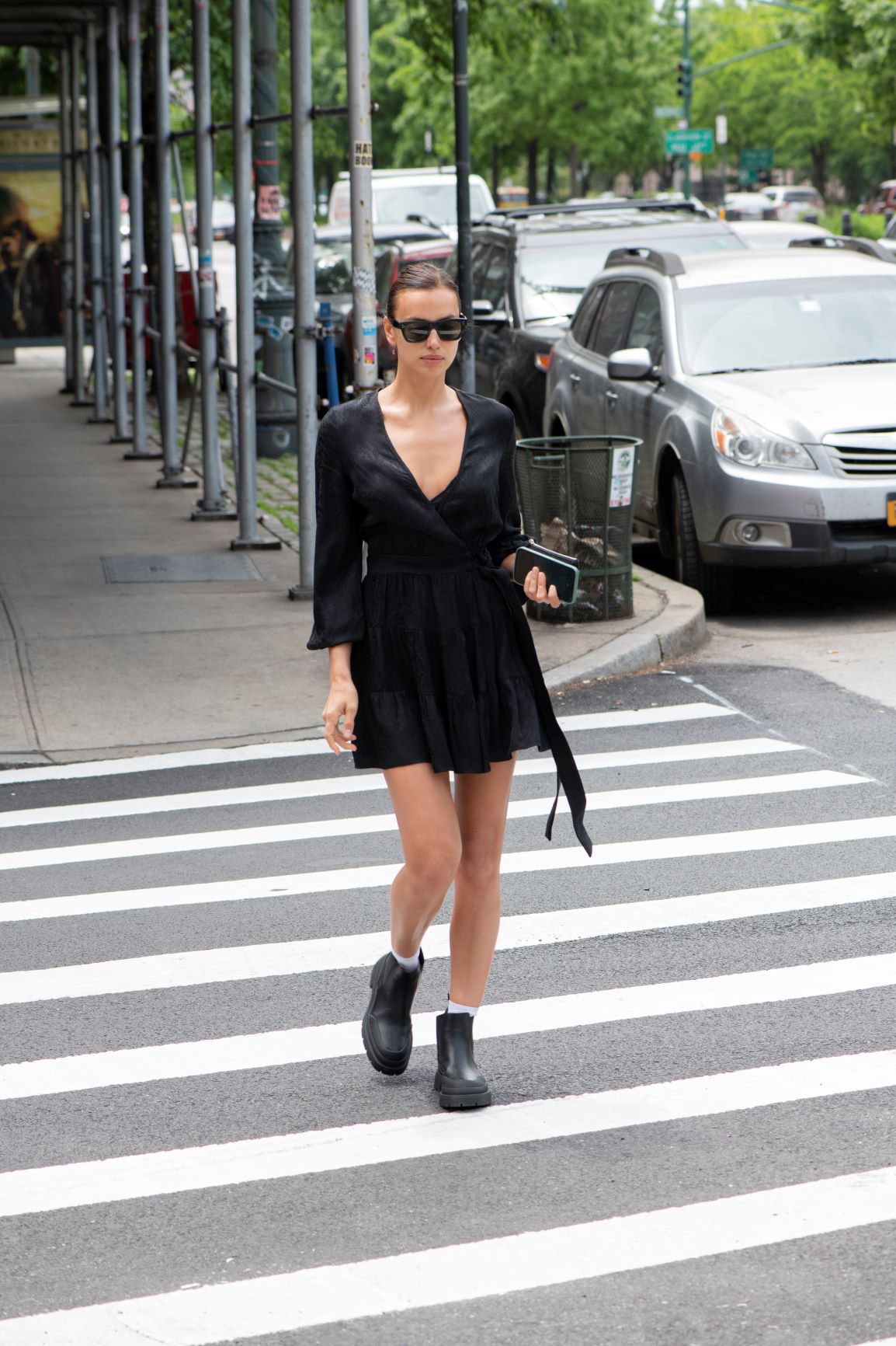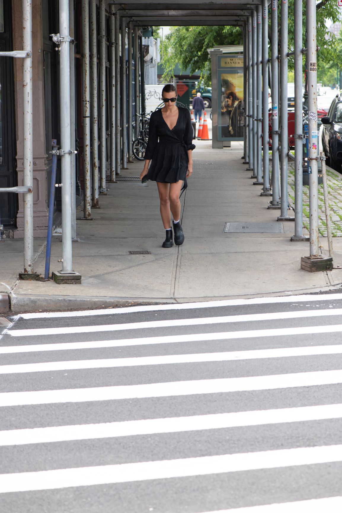 Irina Shayk – jedna z najpopularniejszych światowych modelek – została uchwycona na ulicach Nowego Jorku w czarnym total looku. Modelka miała na sobie kopertową mini sukienkę reaktywowanej polskiej marki Rage Age. Masywnymi czarnymi botkami przełamała dziewczęcy look, tworząc casualową stylizację osadzoną w aktualnych trendach. Modowego akcentu dodały również białe skarpetki wystające z militarnych botków oraz ciemne okulary.