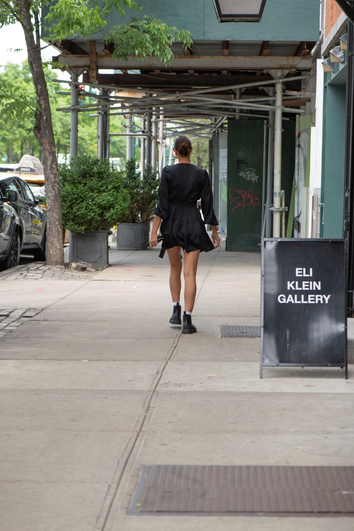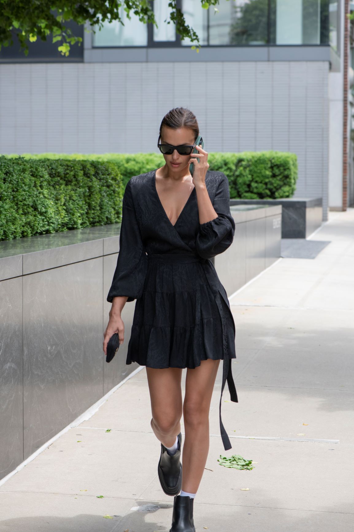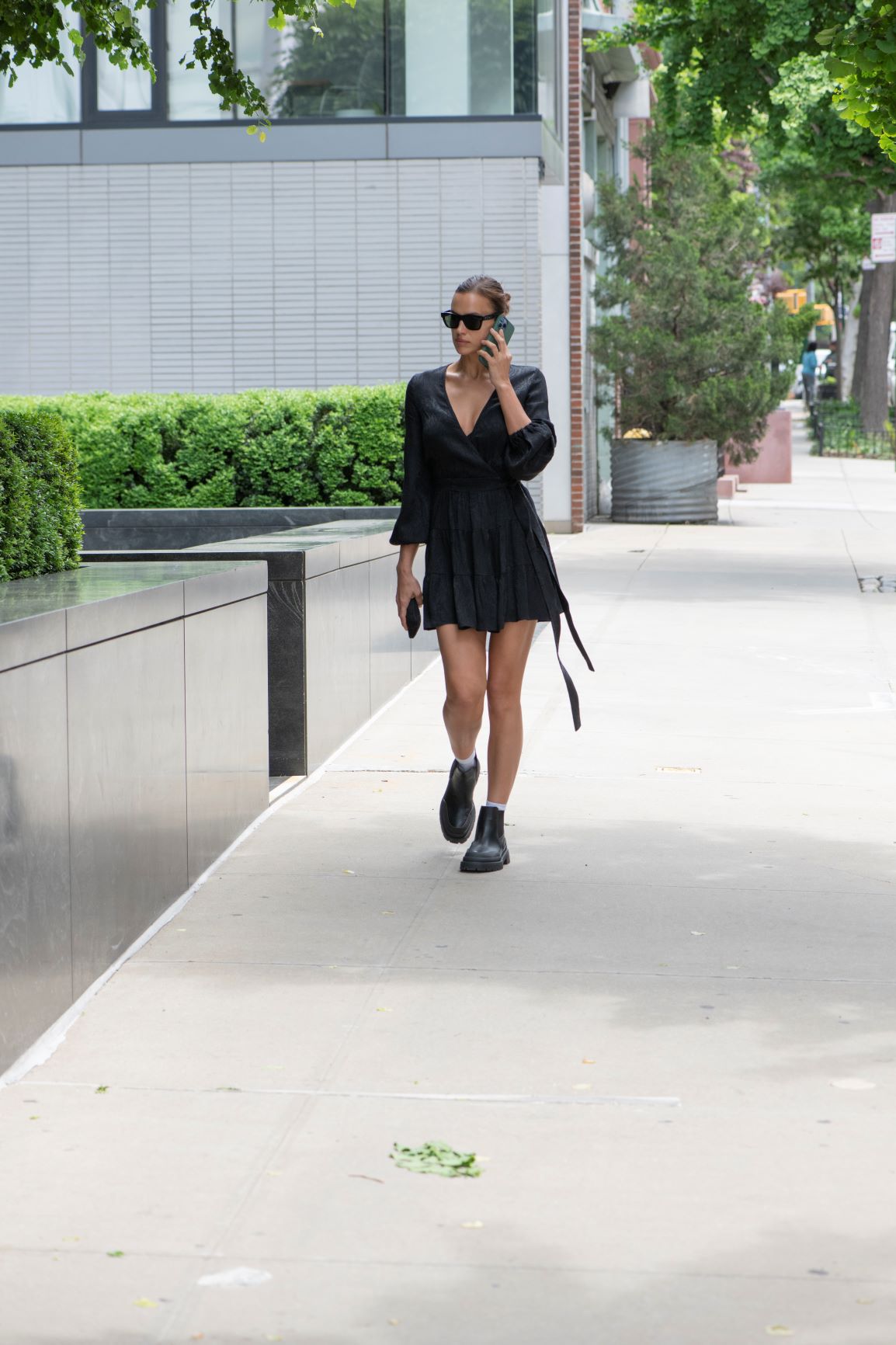 Irina Shayk – jedna z najpopularniejszych światowych modelek – została uchwycona na ulicach Nowego Jorku w czarnym total looku. Modelka miała na sobie kopertową mini sukienkę reaktywowanej polskiej marki Rage Age. Masywnymi czarnymi botkami przełamała dziewczęcy look, tworząc casualową stylizację osadzoną w aktualnych trendach. Modowego akcentu dodały również białe skarpetki wystające z militarnych botków oraz ciemne okulary.