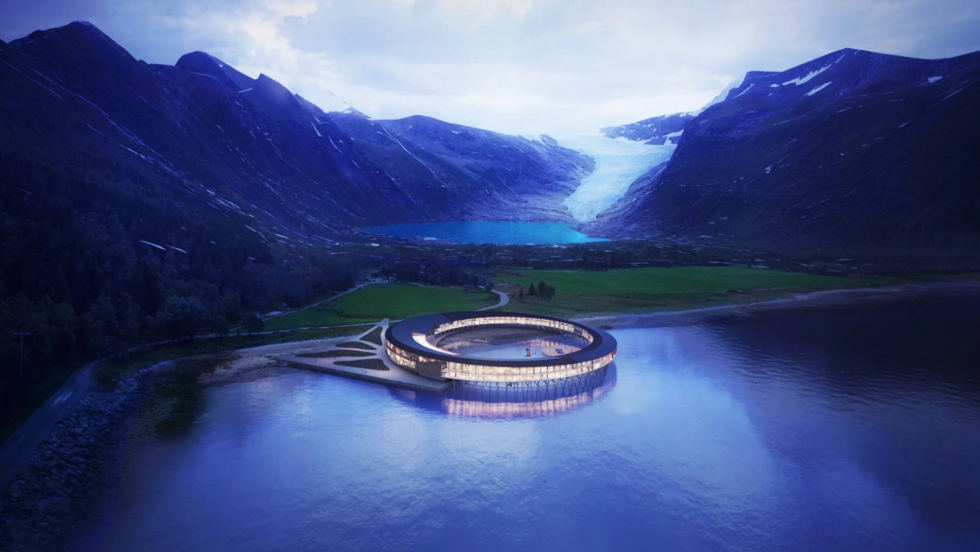 Niezwykły projekt hotelu firmy architektonicznej Snøhetta o kształcie pierścienia będzie położony u podnóża lodowca i ma produkować więcej energii niż zużywać.