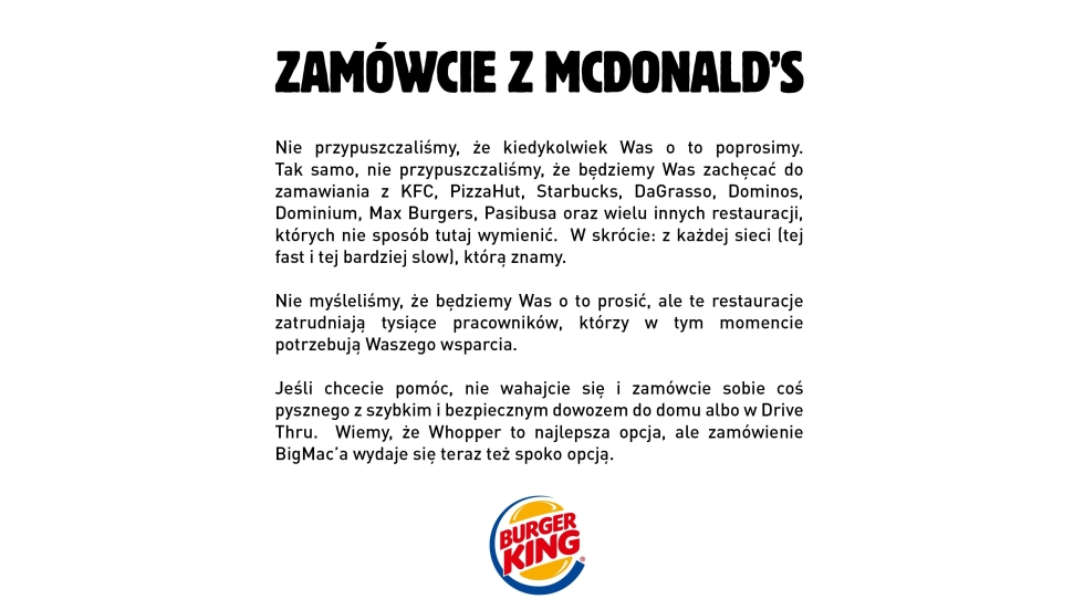 Burger King opublikował oświadczenie, w którym zachęcała swoich klientów do zamawiania jedzenia z oferty sieci McDonald’s, KFC, a także Pasibusa. W ten sposób marka namawiała do wspierania dotkniętej skutkami pandemii branży gastronomicznej.